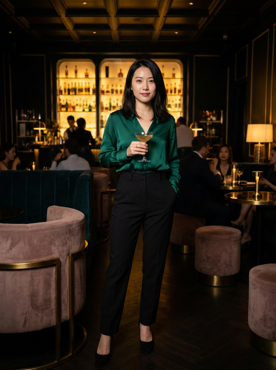 model in a stylish lounge bar with a glamorous ambiance. at night. the model wears a sophisticated evening outfit, such as a silk blouse and tailored pants.
