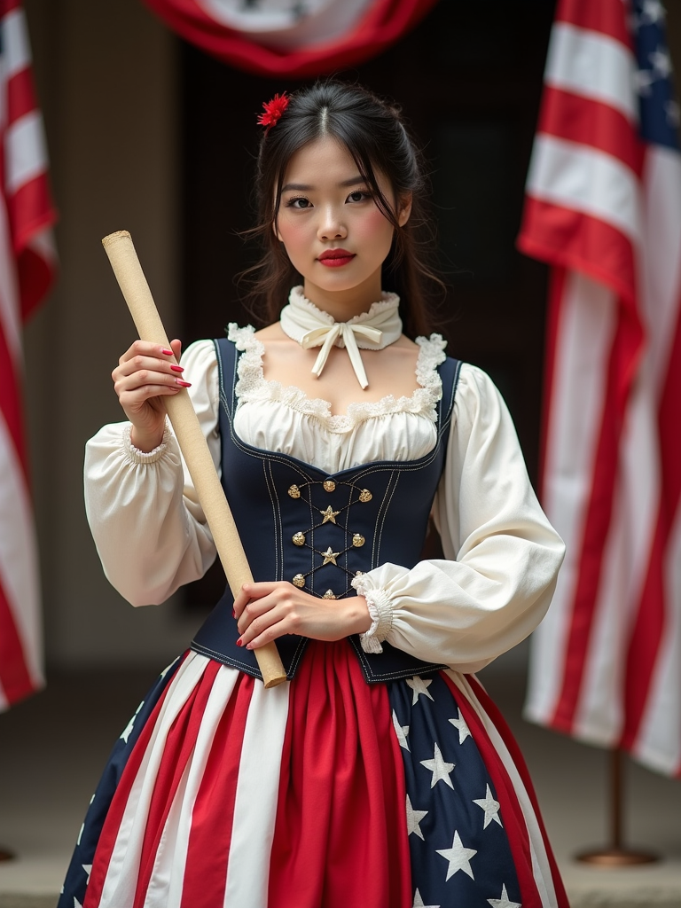 model in a stylized colonial outfit, tight stars and stripes corset and patriotic revolutionary skirt , holding the original 13-star American flag and Declaration of Independence scroll, standing proudly in front of Independence Hall decorated with patriotic bunting.