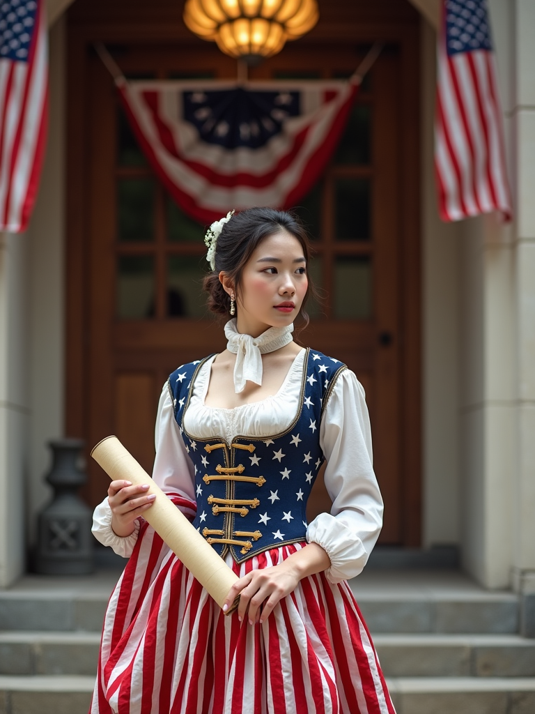 model in a stylized colonial outfit, tight stars and stripes corset and patriotic revolutionary skirt , holding the original 13-star American flag and Declaration of Independence scroll, standing proudly in front of Independence Hall decorated with patriotic bunting.