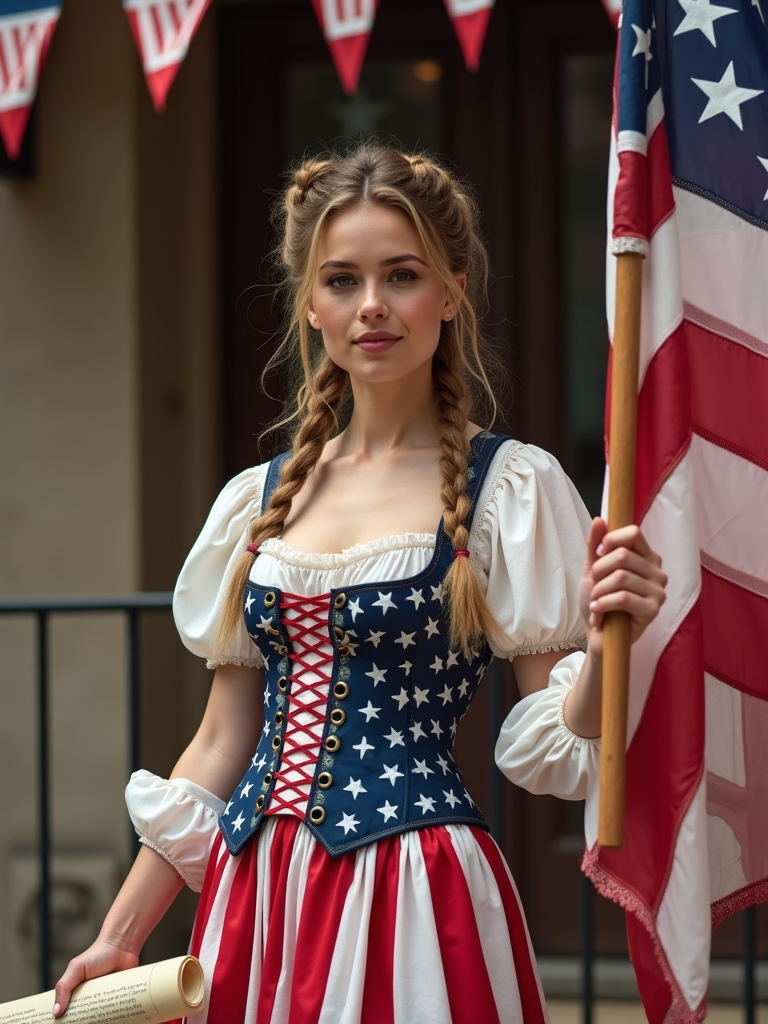 model in a stylized colonial outfit, tight stars and stripes corset and patriotic revolutionary skirt , holding the original 13-star American flag and Declaration of Independence scroll, standing proudly in front of Independence Hall decorated with patriotic bunting.
