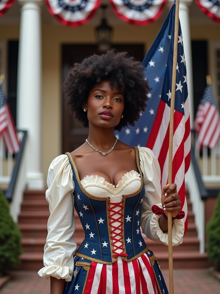 model in a stylized colonial outfit, tight stars and stripes corset and patriotic revolutionary skirt , holding the original 13-star American flag and Declaration of Independence scroll, standing proudly in front of Independence Hall decorated with patriotic bunting.