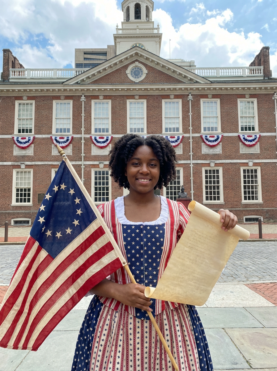 model in a stylized colonial outfit, tight stars and stripes corset and patriotic revolutionary skirt , holding the original 13-star American flag and Declaration of Independence scroll, standing proudly in front of Independence Hall decorated with patriotic bunting.