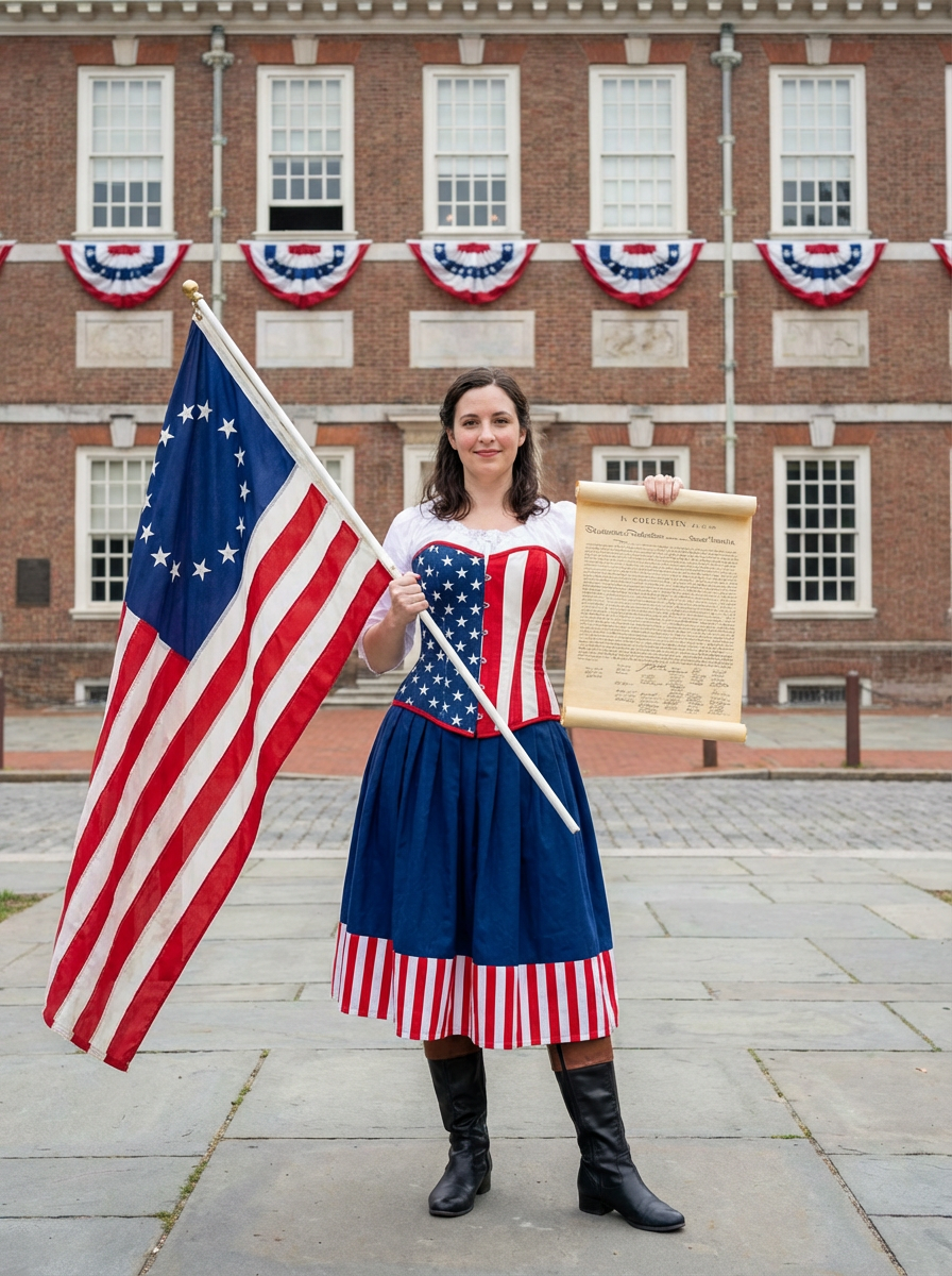 model in a stylized colonial outfit, tight stars and stripes corset and patriotic revolutionary skirt , holding the original 13-star American flag and Declaration of Independence scroll, standing proudly in front of Independence Hall decorated with patriotic bunting.