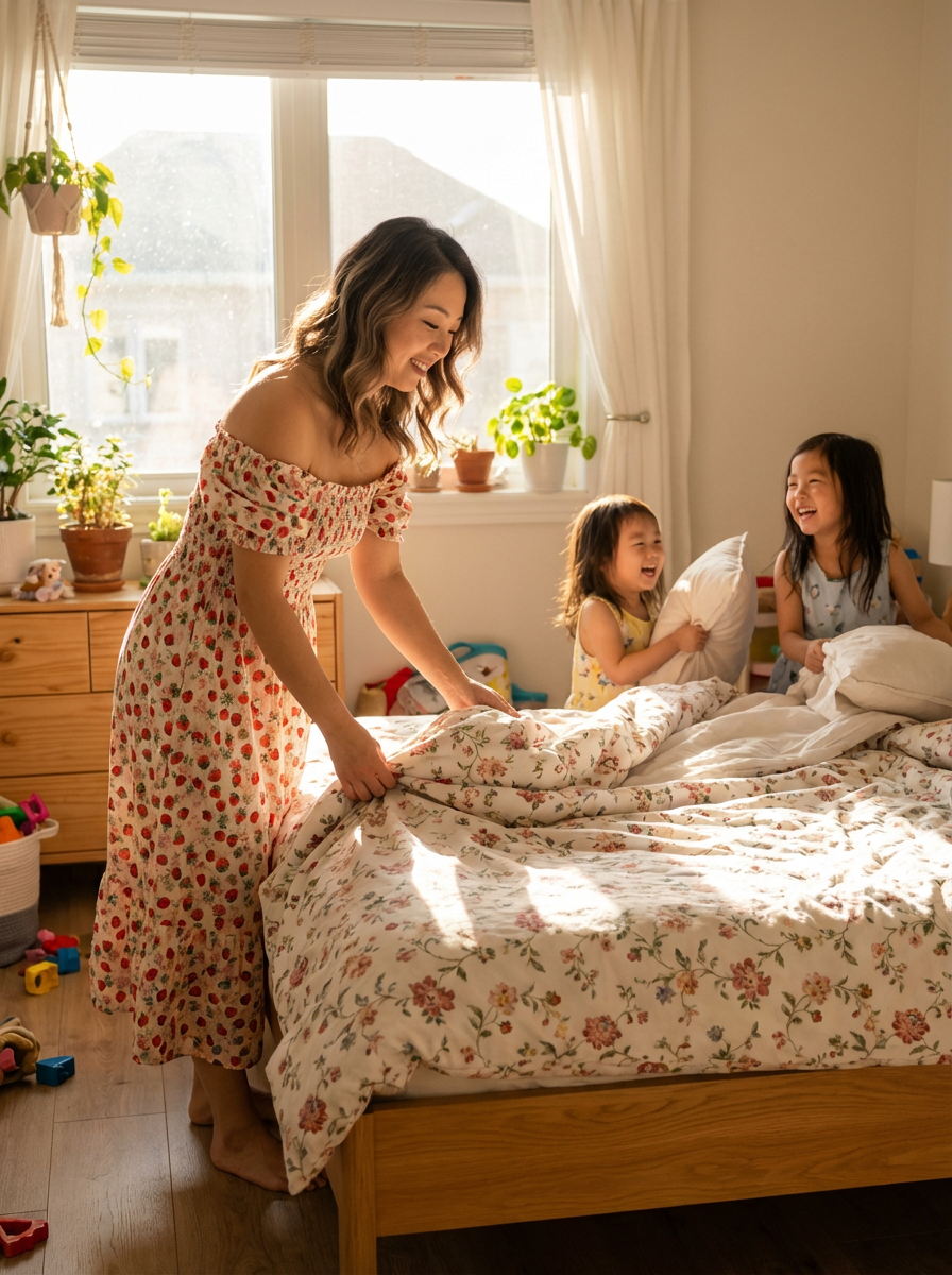model in a sunlit bedroom, making the bed with floral bedding with her two young daughters helping, wearing a floral off-the-shoulder smocked strawberry dress, hair in soft waves, sun shining through the window