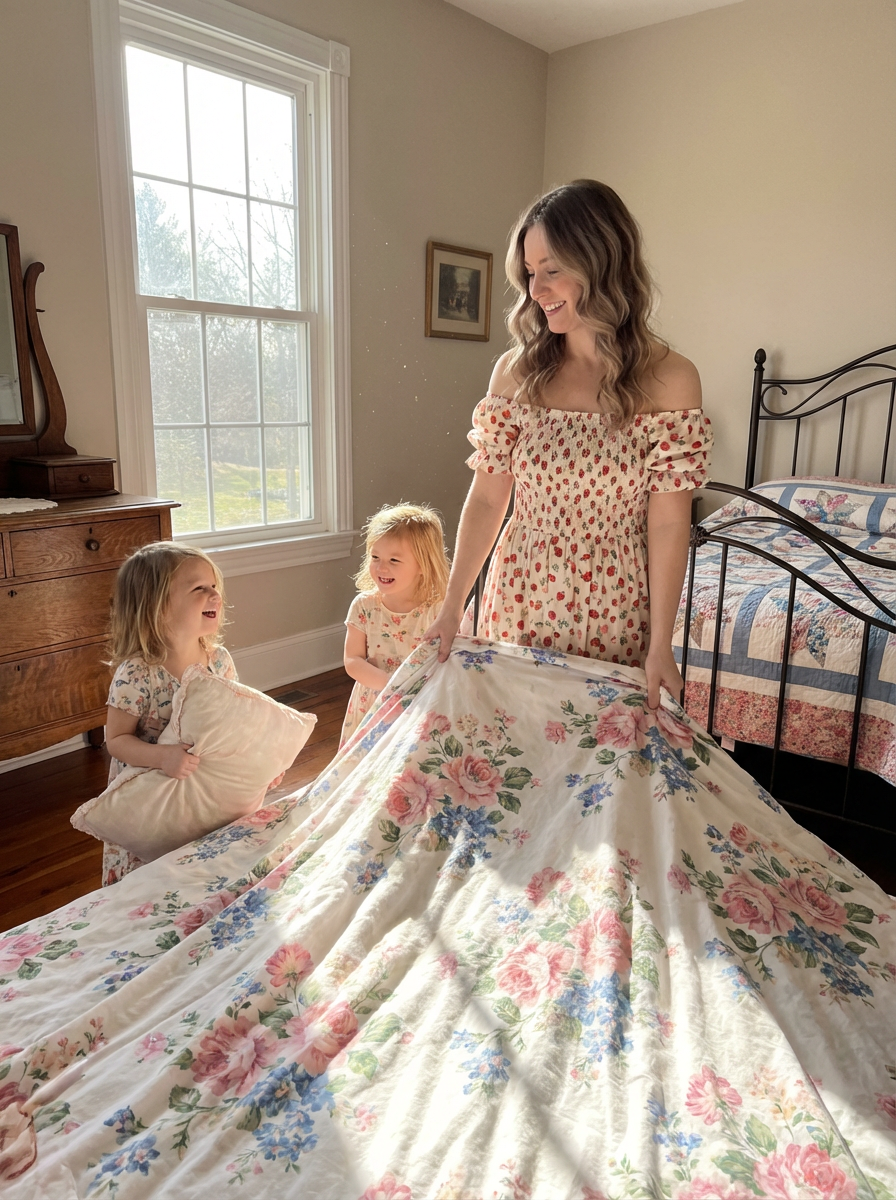 model in a sunlit bedroom, making the bed with floral bedding with her two young daughters helping, wearing a floral off-the-shoulder smocked strawberry dress, hair in soft waves, sun shining through the window