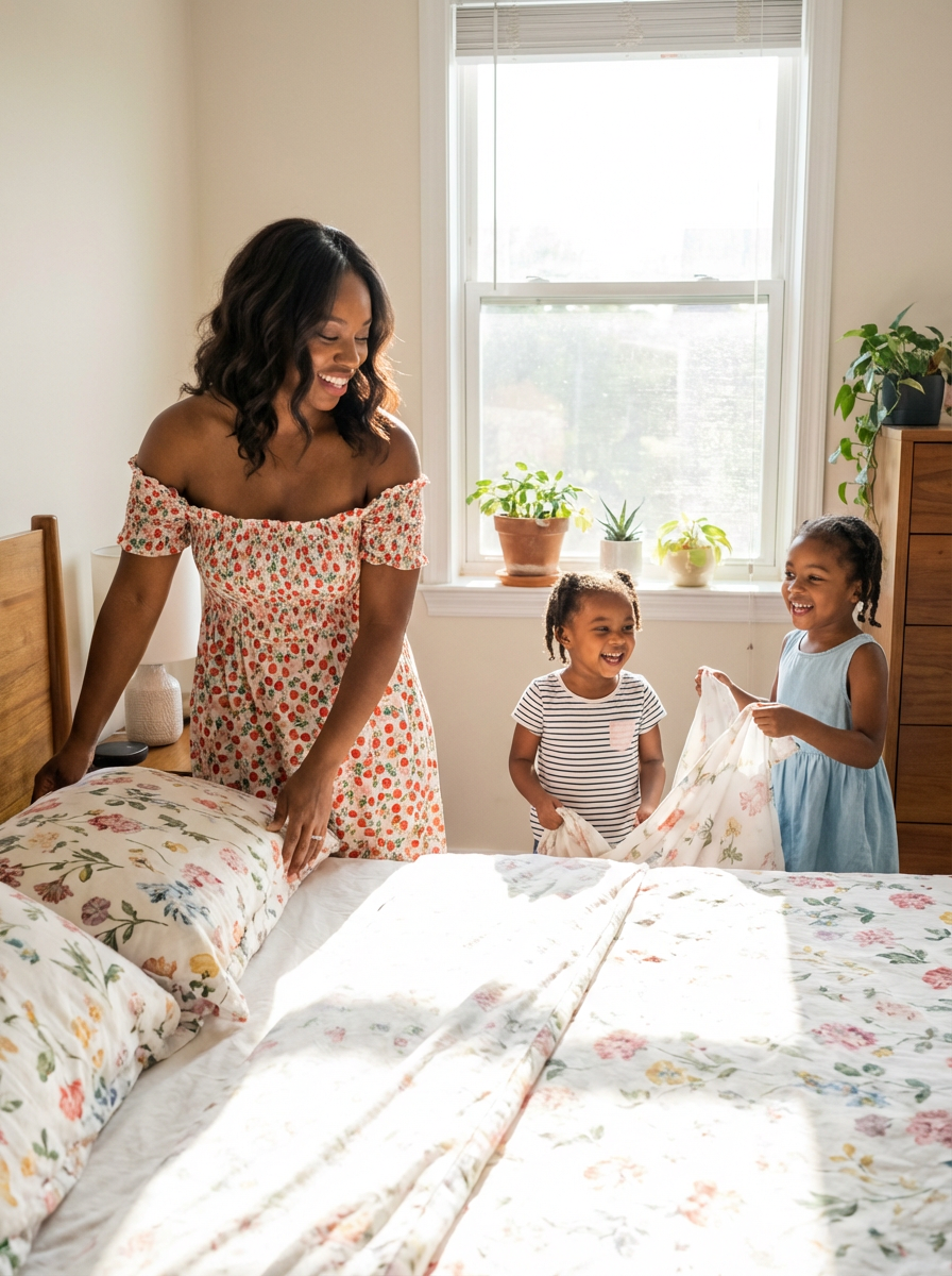 model in a sunlit bedroom, making the bed with floral bedding with her two young daughters helping, wearing a floral off-the-shoulder smocked strawberry dress, hair in soft waves, sun shining through the window