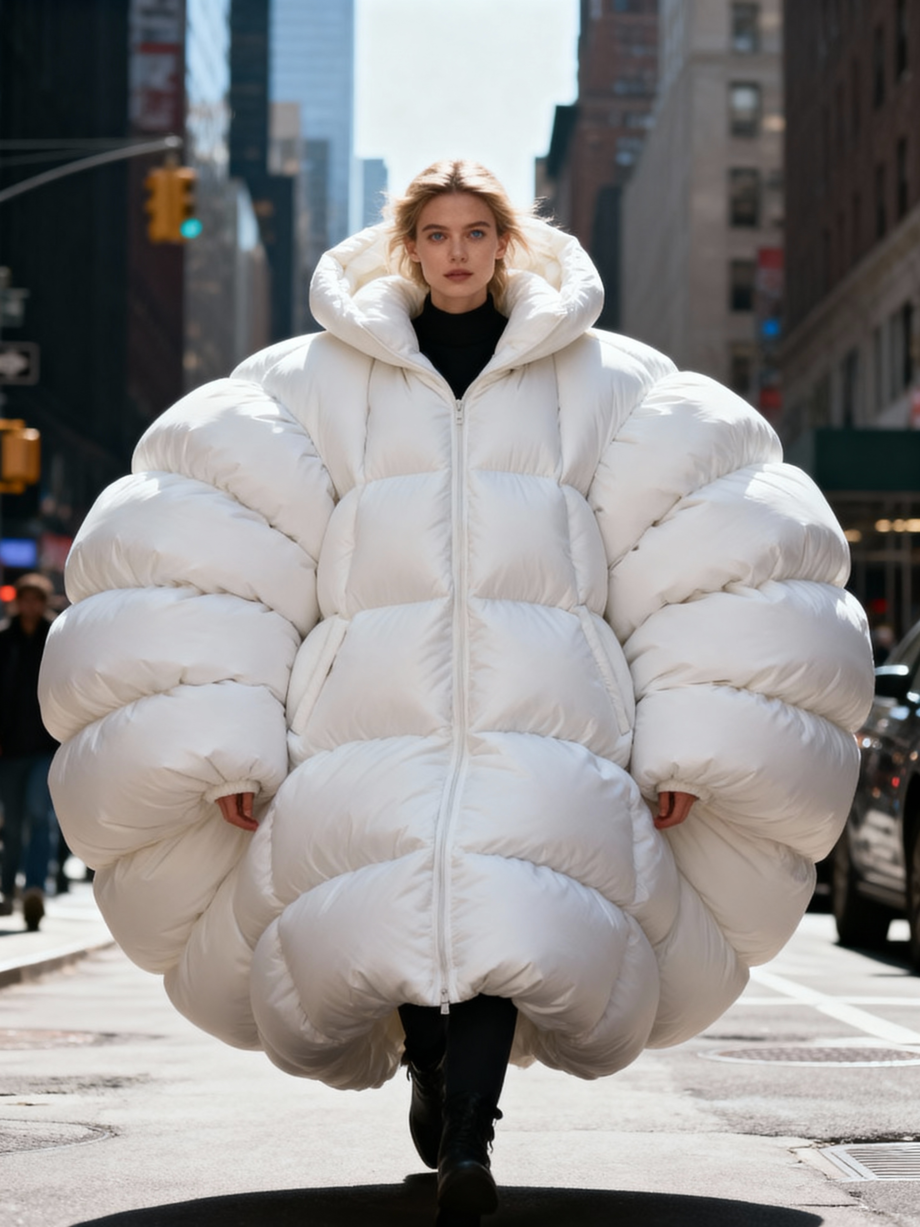 model in a super big round white puffer closed coat with an exaggerated, voluminous design with oversized hood and thick, many quilted sections that contribute to its inflated appearance. the coat is closed and inflated. model is walking outside in New York City street.