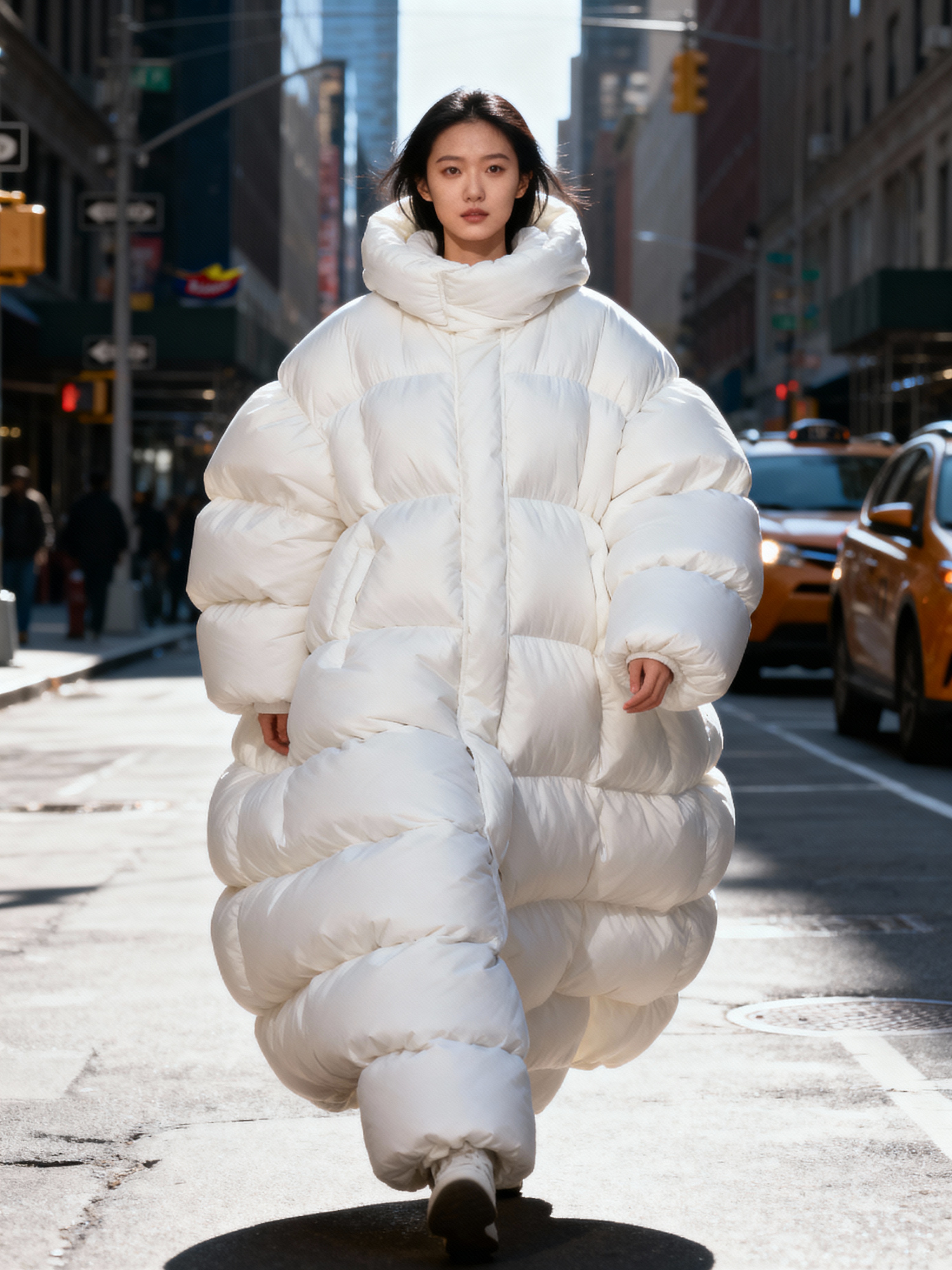 Related photosman in a super big round white puffer closed coat with an exaggerated, voluminous design with oversized hood and thick, many quilted sections that contribute to its inflated appearance. the coat is closed and inflated. man is walking outside in New York City street.side view of man in a super big round white puffer closed coat with an exaggerated, voluminous design with oversized hood and thick, many quilted sections that contribute to its inflated appearance. the coat is closed and inflated. man is walking outside in New York City street.side view of man in a super big round white puffer closed coat with an exaggerated, voluminous design with oversized hood and thick, many quilted sections that contribute to its inflated appearance. the coat is closed and inflated. man is walking outside in New York City street.close-up of Model with a retro 60s makeup vibe, featuring thick eyeliner and pastel eyeshadow, paired with a vintage hairstyle. set against a soft, pastel backgroundwoman in style of Van Gogh, elegant, intricate, digital painting, artstation, concept art, smooth, sharp focus, illustration, art by van goghman in silver metallic glossy style, wearing shiny glossy metallic glossy fashion