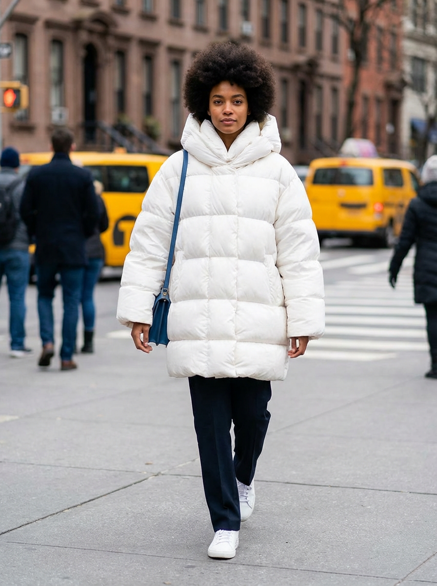 Related photosside view of woman in a super big round white puffer closed coat with an exaggerated, voluminous design with oversized hood and thick, many quilted sections that contribute to its inflated appearance. the coat is closed and inflated. woman is walking outside in New York City street.woman in a super big round white puffer closed coat with an exaggerated, voluminous design with oversized hood and thick, many quilted sections that contribute to its inflated appearance. the coat is closed and inflated. woman is walking outside in New York City street.side view of man in a super big round white puffer closed coat with an exaggerated, voluminous design with oversized hood and thick, many quilted sections that contribute to its inflated appearance. the coat is closed and inflated. man is walking outside in New York City street.Front view of a man standing outdoors, looking slightly to the left.  wearing a black, long-sleeve button-up shirt with the top button undone and the sleeves casually rolled up to the elbows. the left hand is in a pants pocket. in the background, an open wooden door and a yellow and white building facade are visible.a stunning woman in a flowy kimono and flower crown , embodying the fusion of bohemian and rock n roll styles at the festivalwoman | standing in field full of flowers | detailed gorgeous face! ! | full body! ! | god rays | intricate | elegant | realistic | hyperrealistic | cinematic | character design | concept art | illustration | digital art | digital painting | depth of field