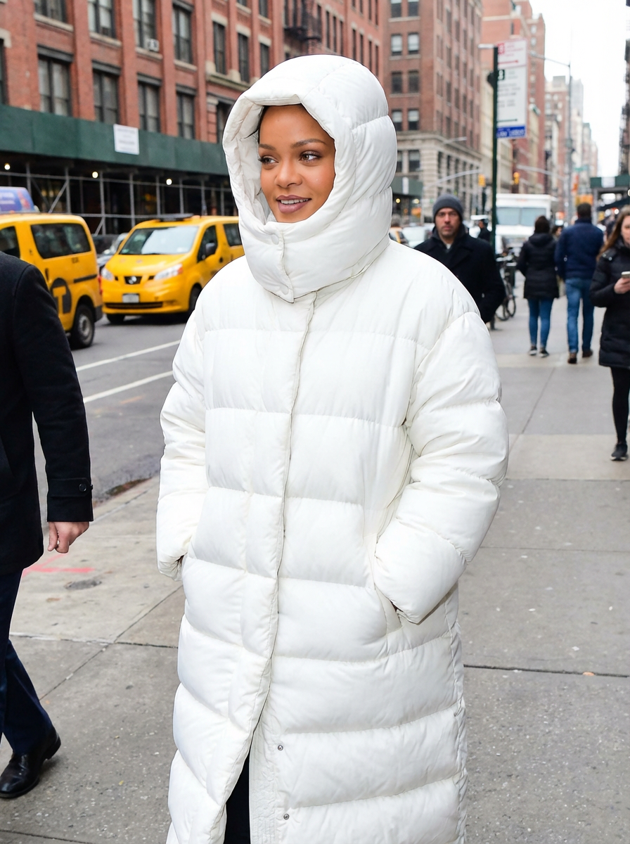 model in a super big round white puffer closed coat with an exaggerated, voluminous design with oversized hood and thick, many quilted sections that contribute to its inflated appearance. the coat is closed and inflated. model is walking outside in New York City street.
