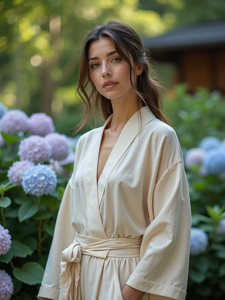 model in a traditional Japanese garden, wearing a light kimono-inspired top with wide-leg pants , surrounded by blooming hydrangeas