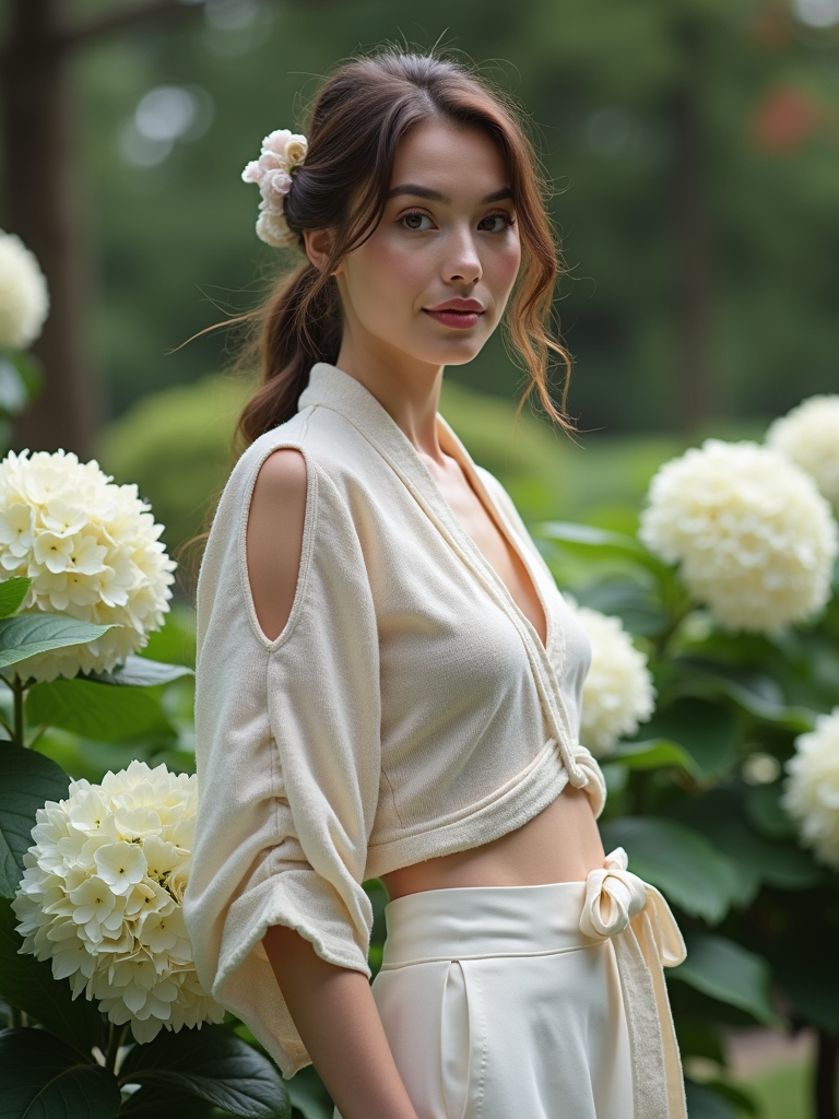 model in a traditional Japanese garden, wearing a light kimono-inspired top with wide-leg pants , surrounded by blooming hydrangeas