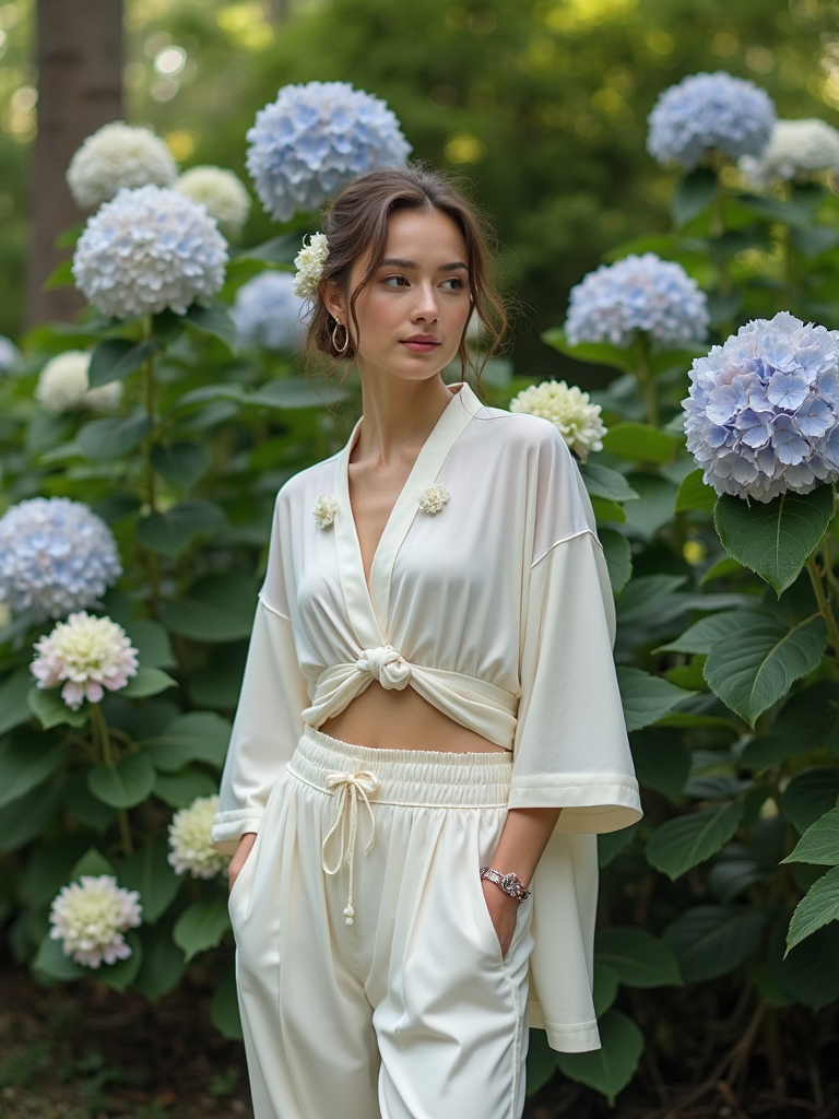 model in a traditional Japanese garden, wearing a light kimono-inspired top with wide-leg pants , surrounded by blooming hydrangeas