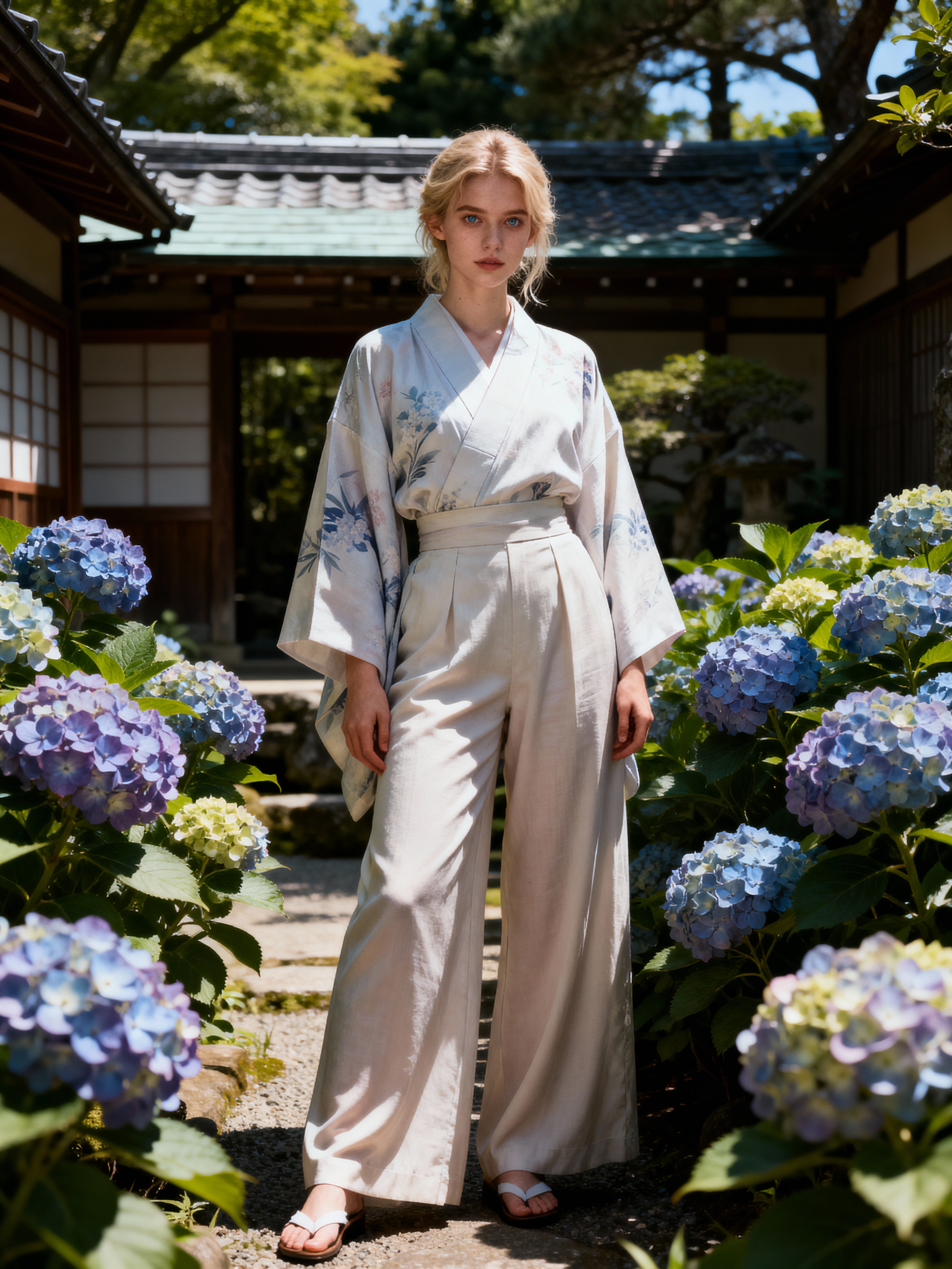 model in a traditional Japanese garden, wearing a light kimono-inspired top with wide-leg pants , surrounded by blooming hydrangeas