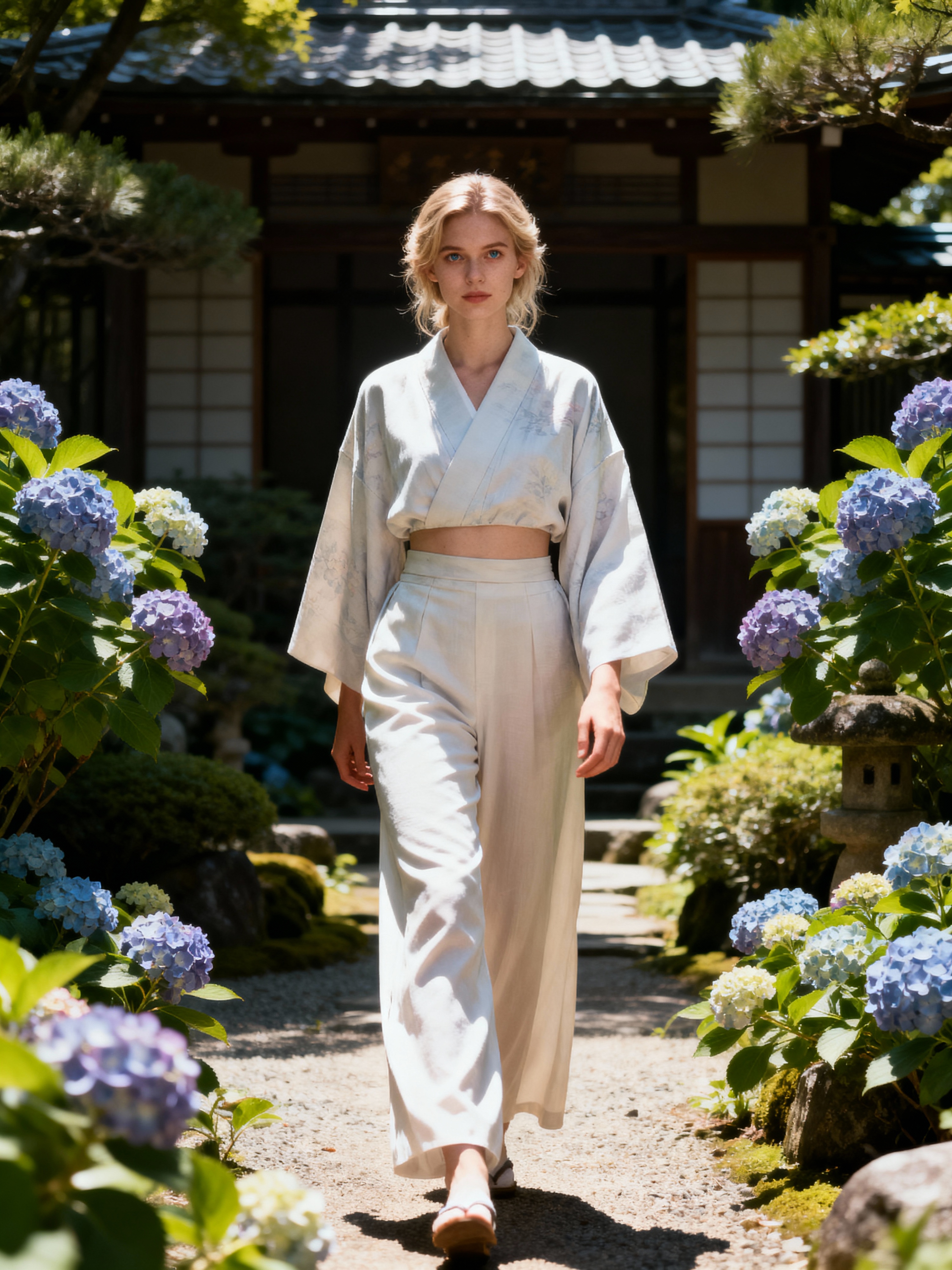 model in a traditional Japanese garden, wearing a light kimono-inspired top with wide-leg pants , surrounded by blooming hydrangeas