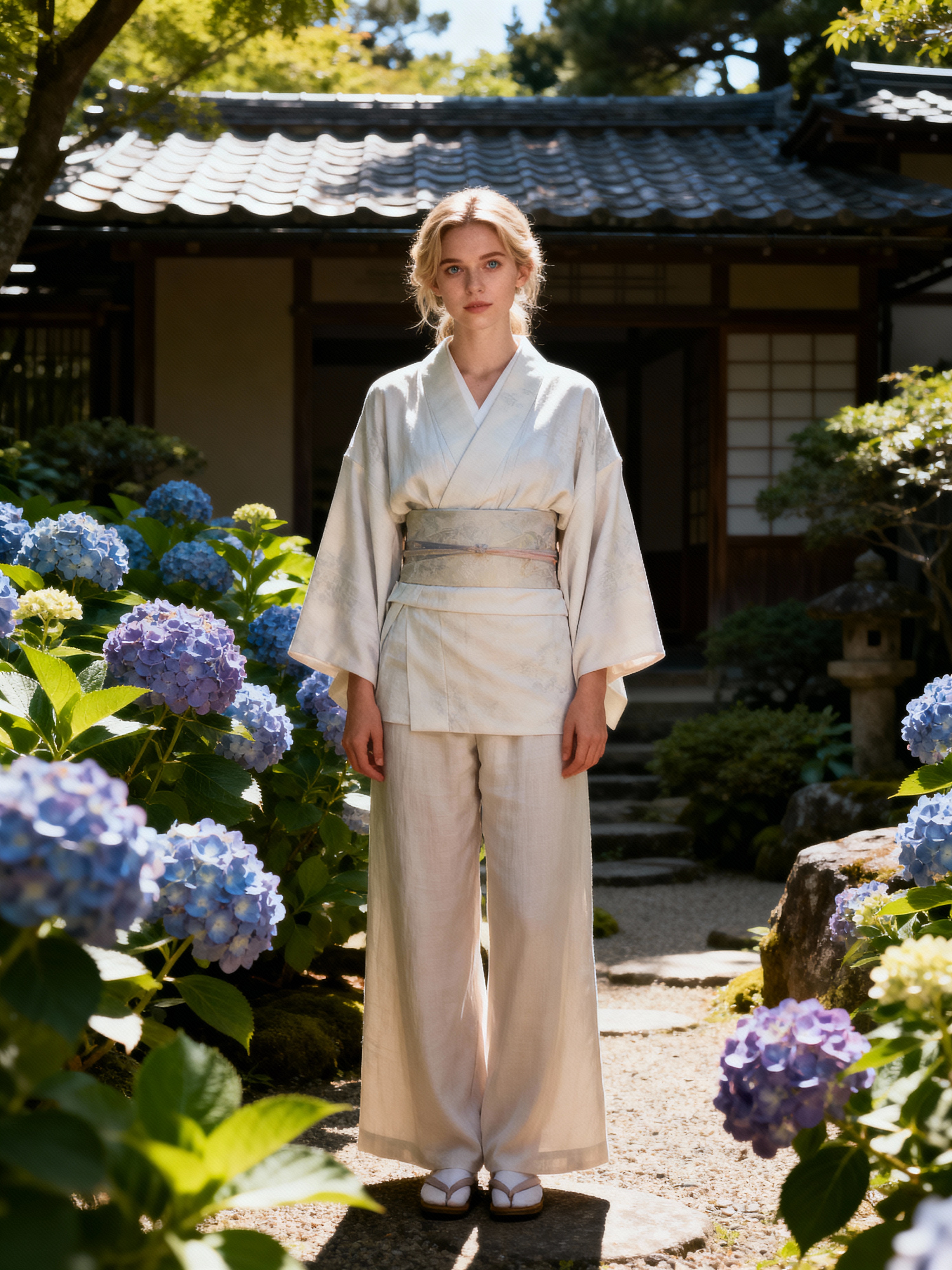 model in a traditional Japanese garden, wearing a light kimono-inspired top with wide-leg pants , surrounded by blooming hydrangeas