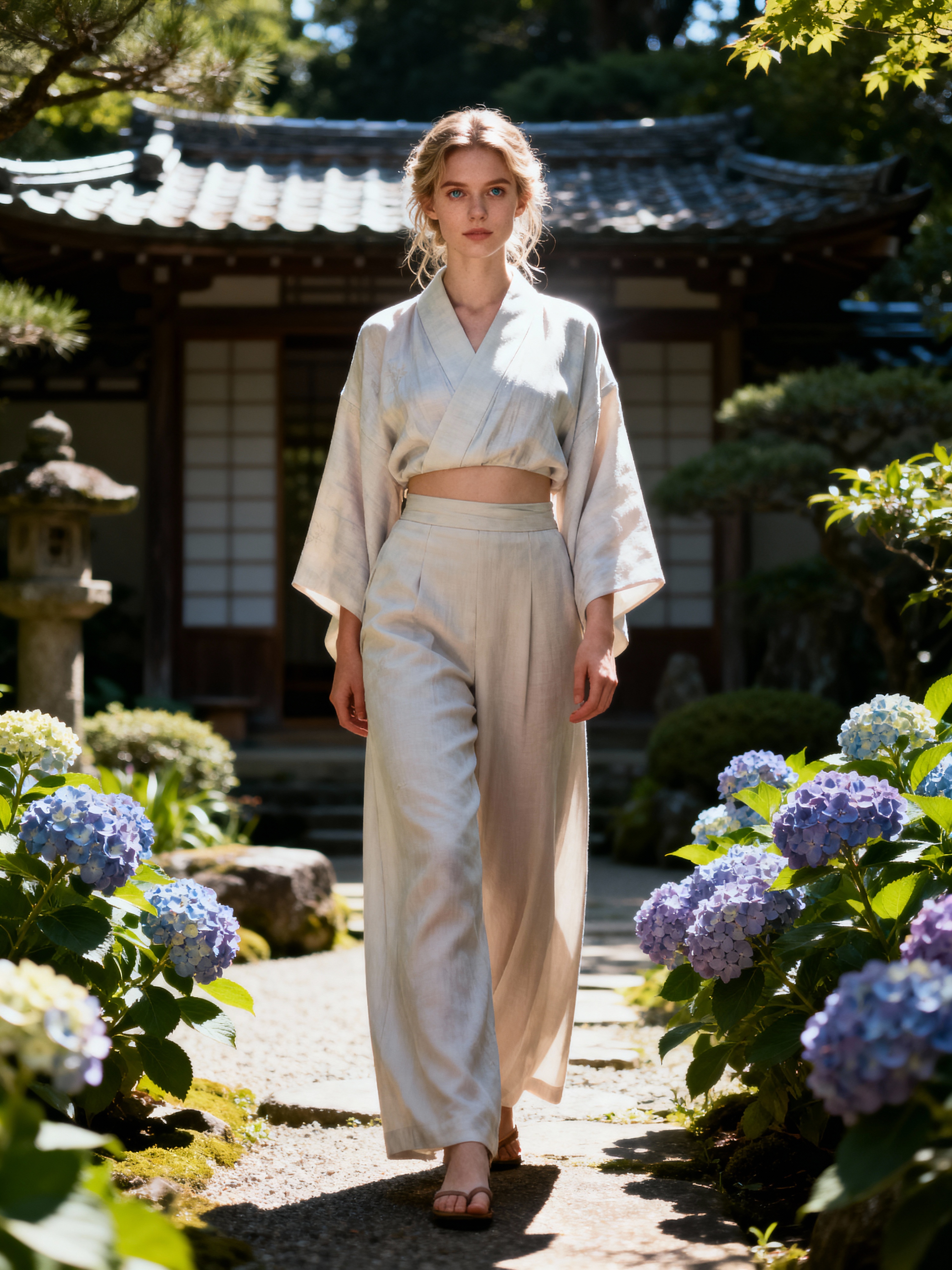 model in a traditional Japanese garden, wearing a light kimono-inspired top with wide-leg pants , surrounded by blooming hydrangeas