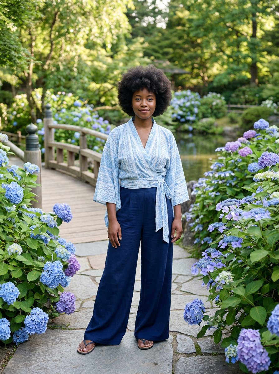 model in a traditional Japanese garden, wearing a light kimono-inspired top with wide-leg pants , surrounded by blooming hydrangeas