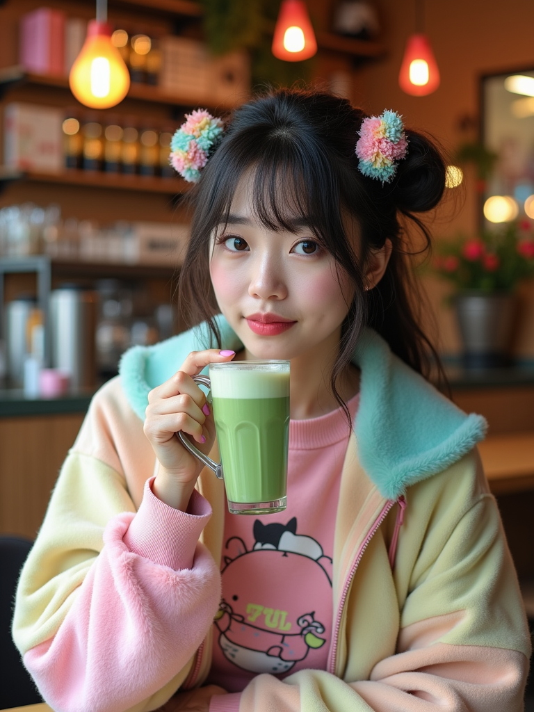 model in a trendy café in Harajuku, wearing a kawaii-inspired outfit with colorful accessories , drinking matcha latte