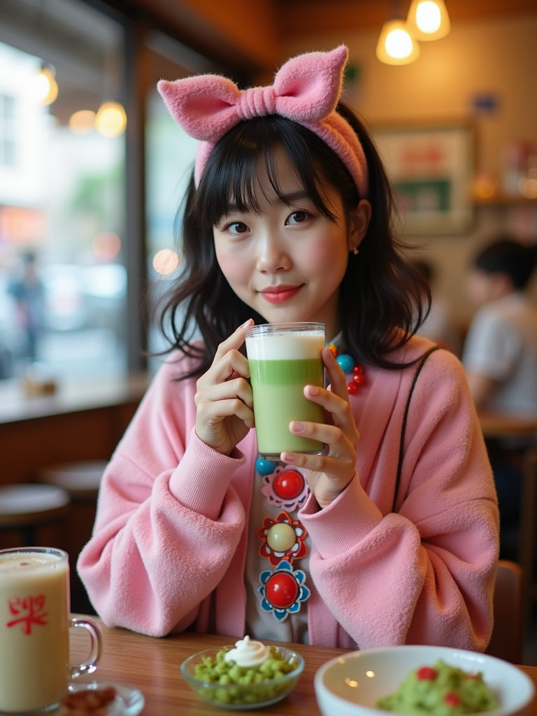 model in a trendy café in Harajuku, wearing a kawaii-inspired outfit with colorful accessories , drinking matcha latte