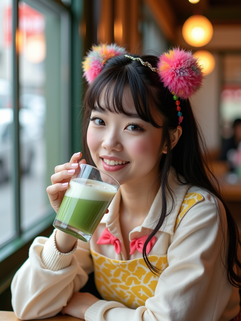 model in a trendy café in Harajuku, wearing a kawaii-inspired outfit with colorful accessories , drinking matcha latte