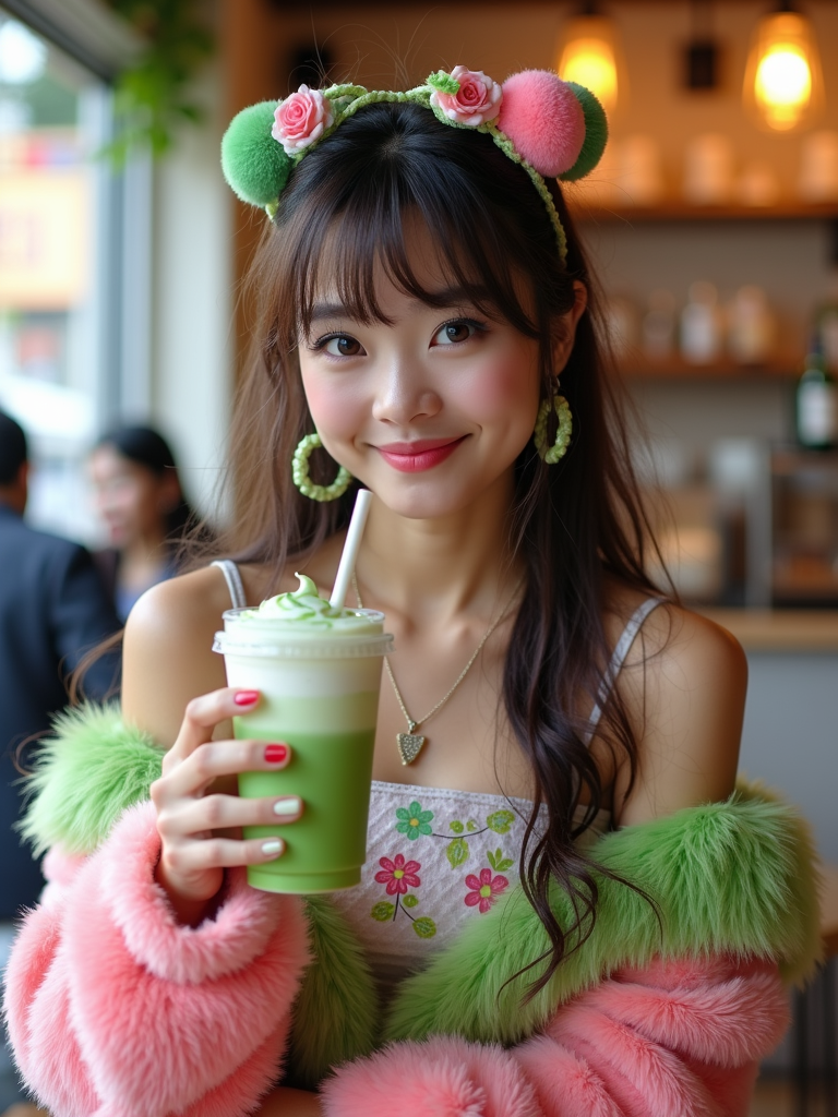 model in a trendy café in Harajuku, wearing a kawaii-inspired outfit with colorful accessories , drinking matcha latte