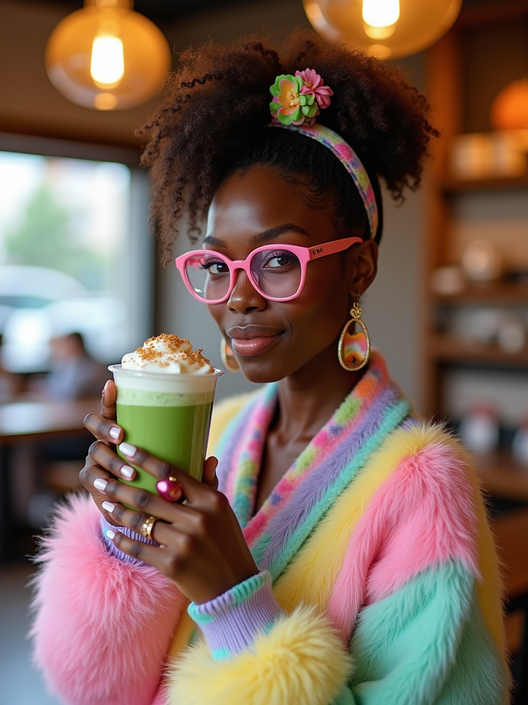 model in a trendy café in Harajuku, wearing a kawaii-inspired outfit with colorful accessories , drinking matcha latte
