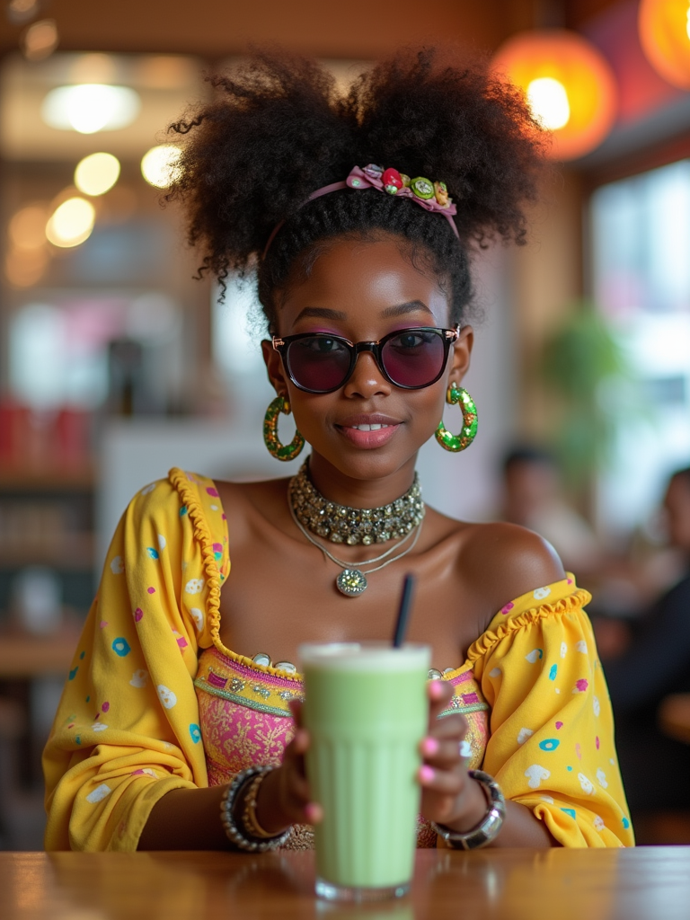 model in a trendy café in Harajuku, wearing a kawaii-inspired outfit with colorful accessories , drinking matcha latte