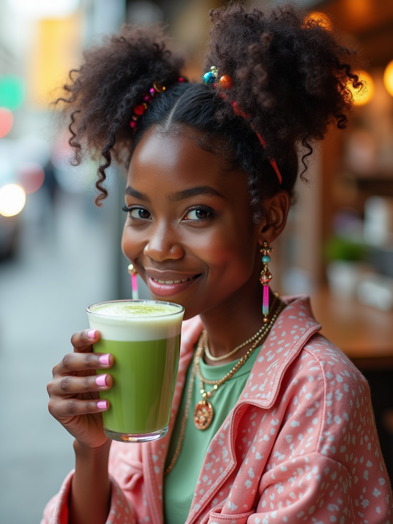 model in a trendy café in Harajuku, wearing a kawaii-inspired outfit with colorful accessories , drinking matcha latte