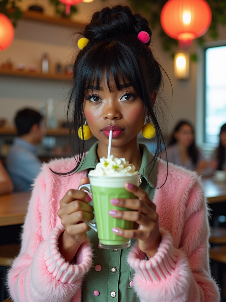 model in a trendy café in Harajuku, wearing a kawaii-inspired outfit with colorful accessories , drinking matcha latte