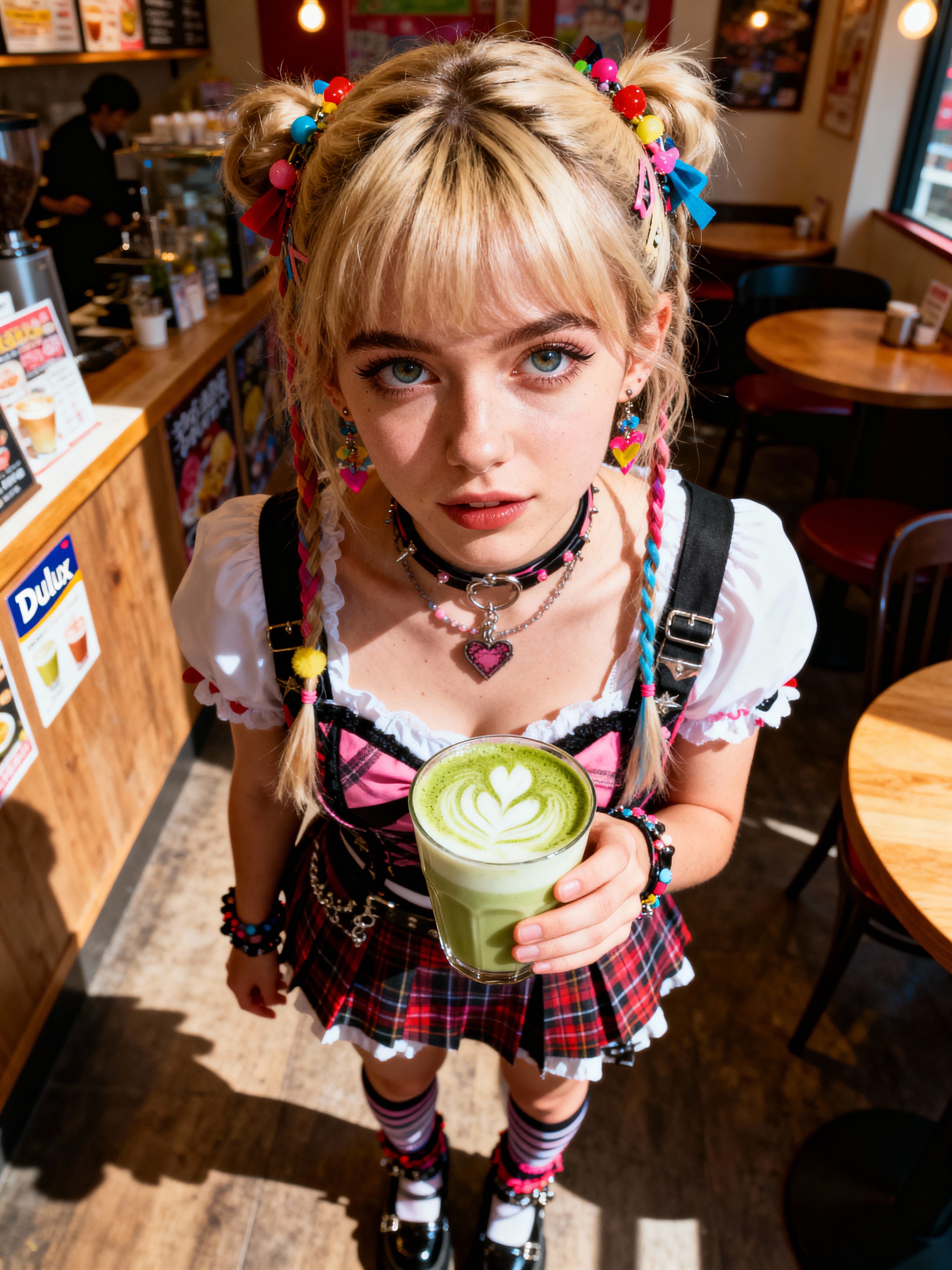 model in a trendy café in Harajuku, wearing a kawaii-inspired outfit with colorful accessories , drinking matcha latte