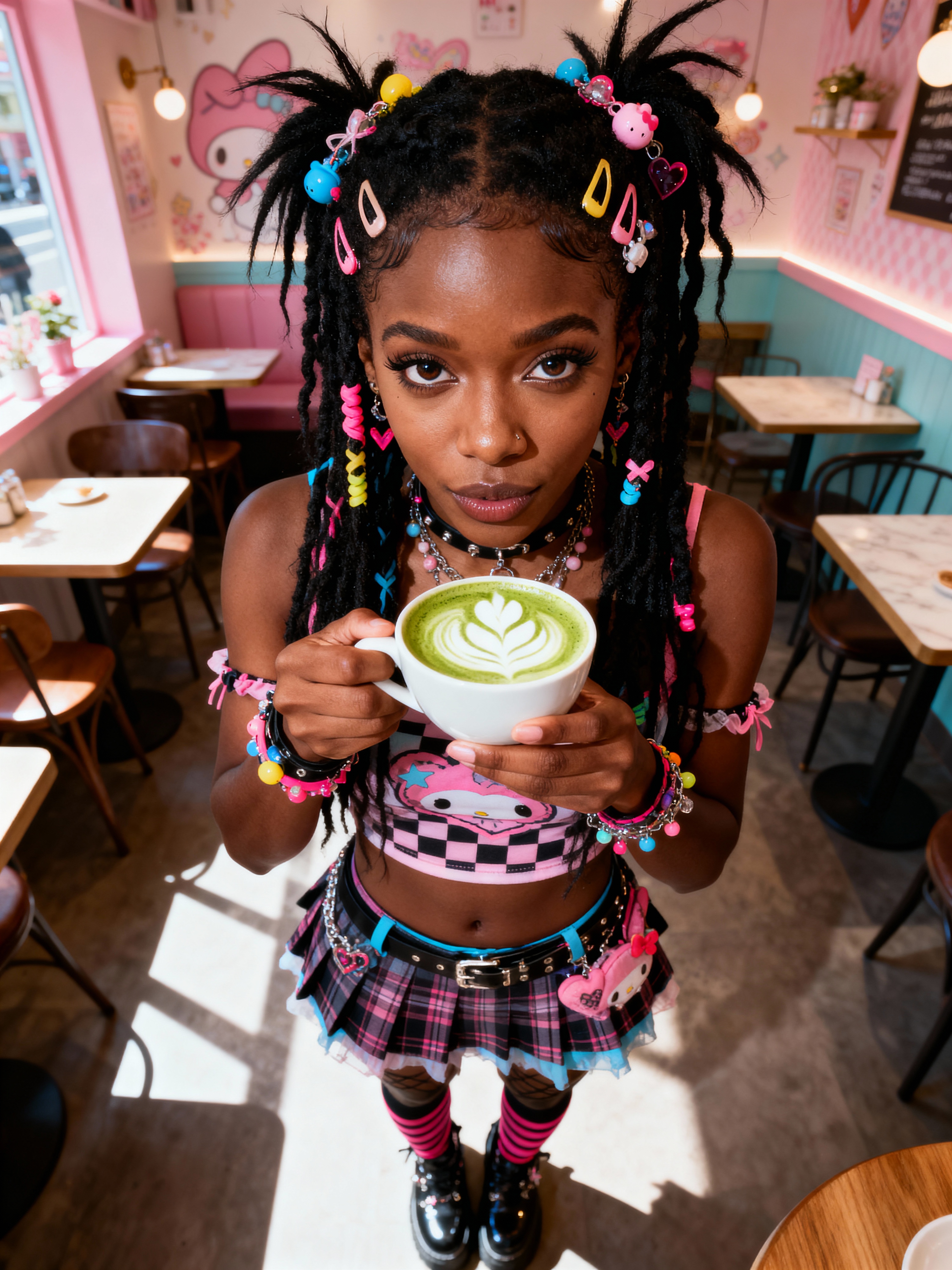model in a trendy café in Harajuku, wearing a kawaii-inspired outfit with colorful accessories , drinking matcha latte