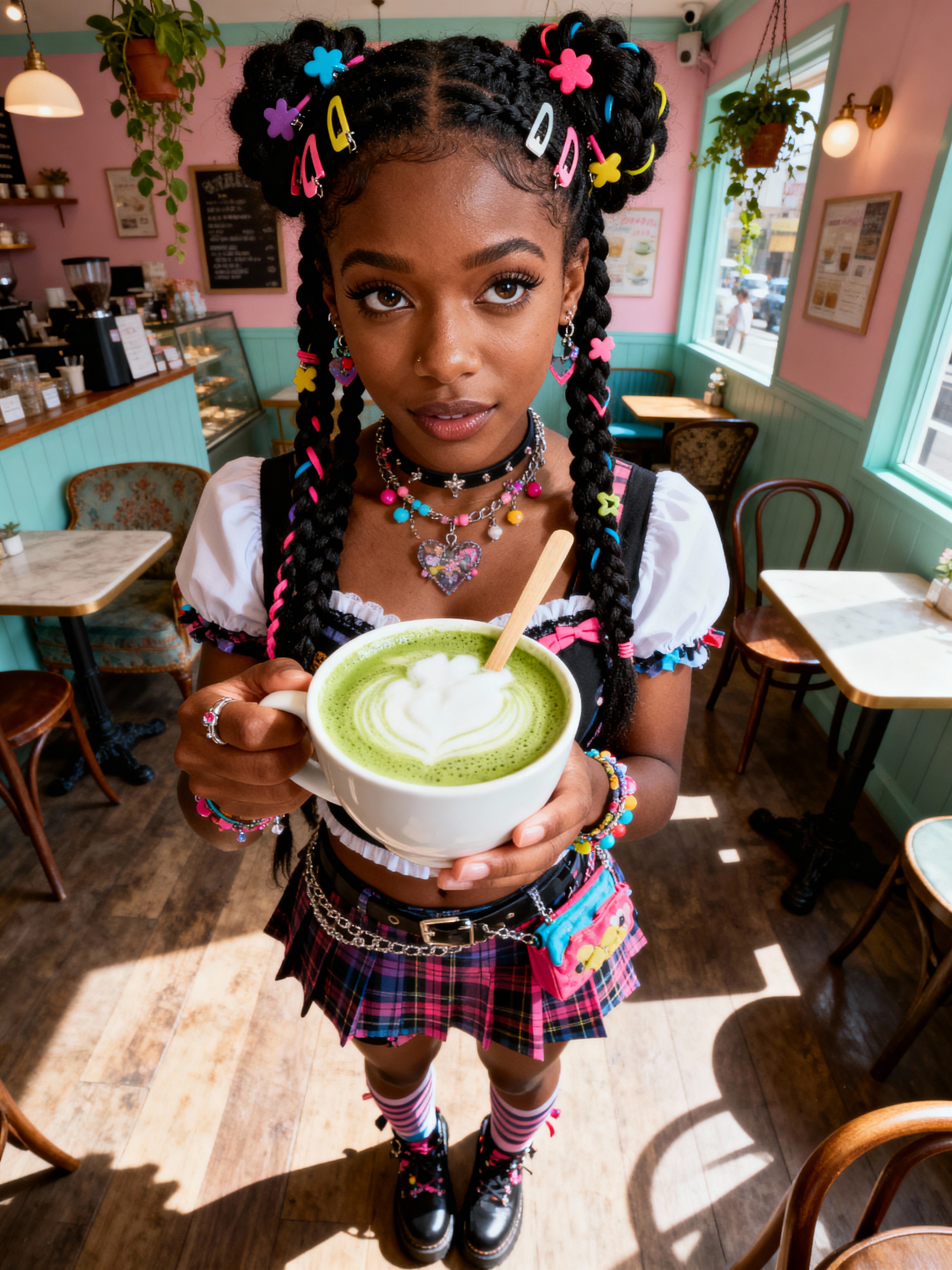 model in a trendy café in Harajuku, wearing a kawaii-inspired outfit with colorful accessories , drinking matcha latte