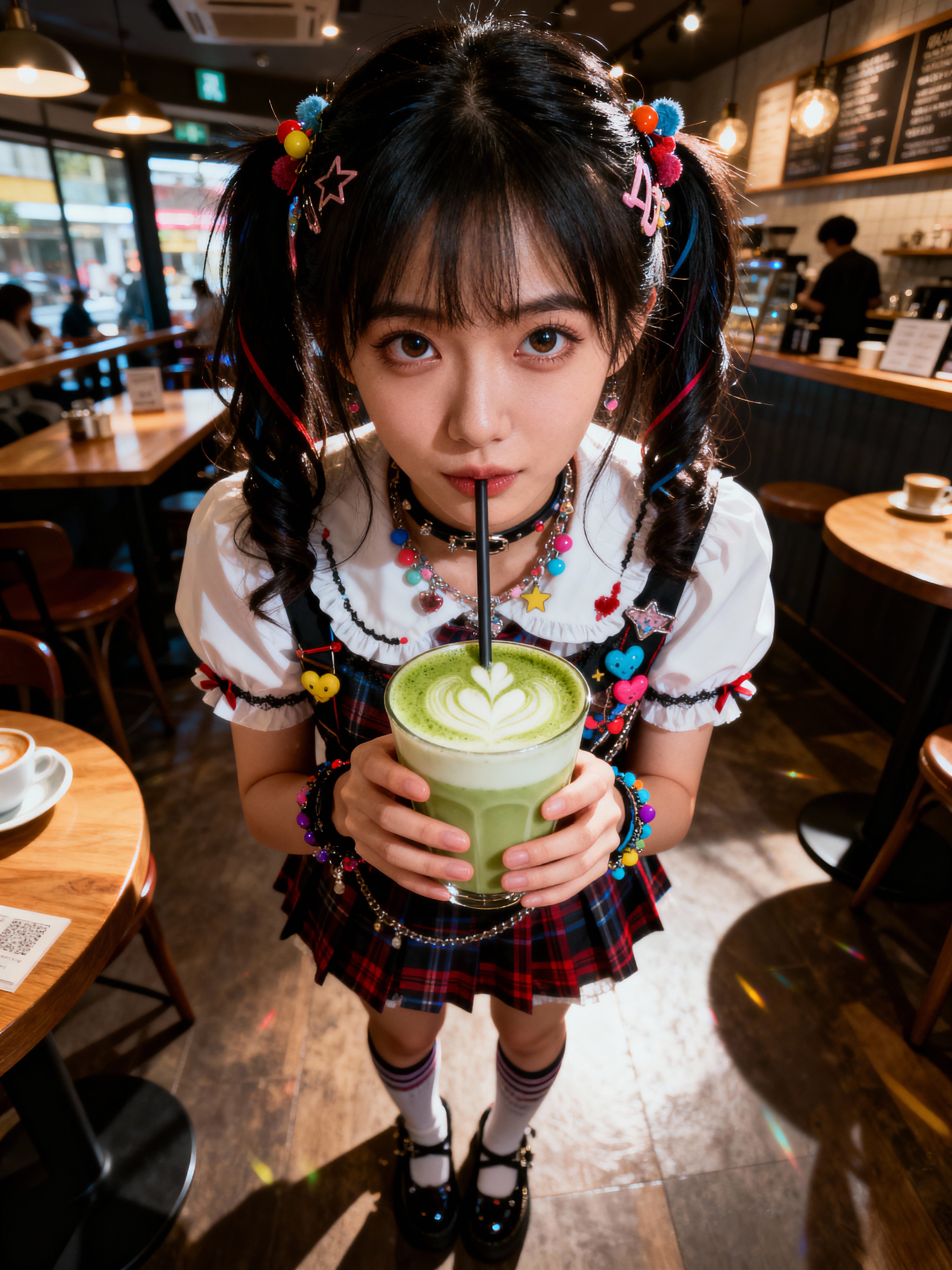 model in a trendy café in Harajuku, wearing a kawaii-inspired outfit with colorful accessories , drinking matcha latte