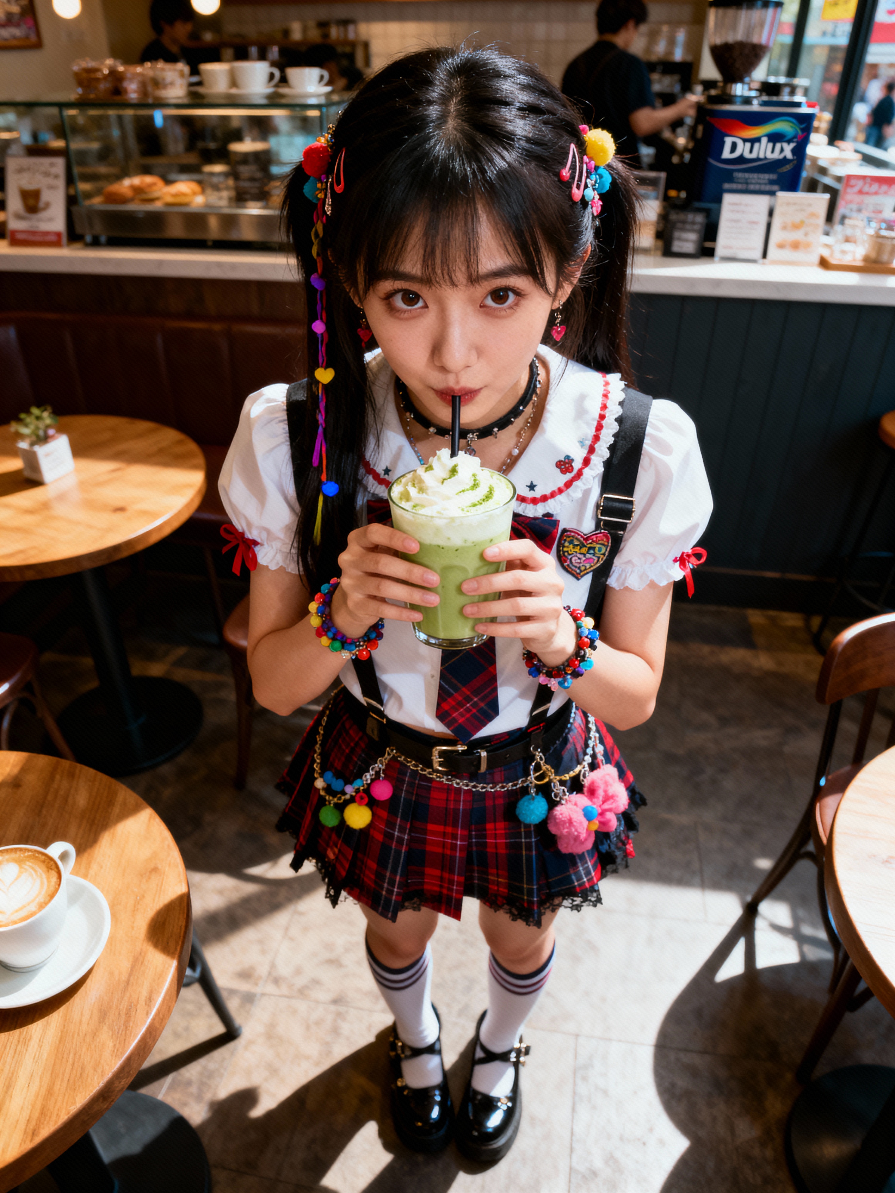 model in a trendy café in Harajuku, wearing a kawaii-inspired outfit with colorful accessories , drinking matcha latte