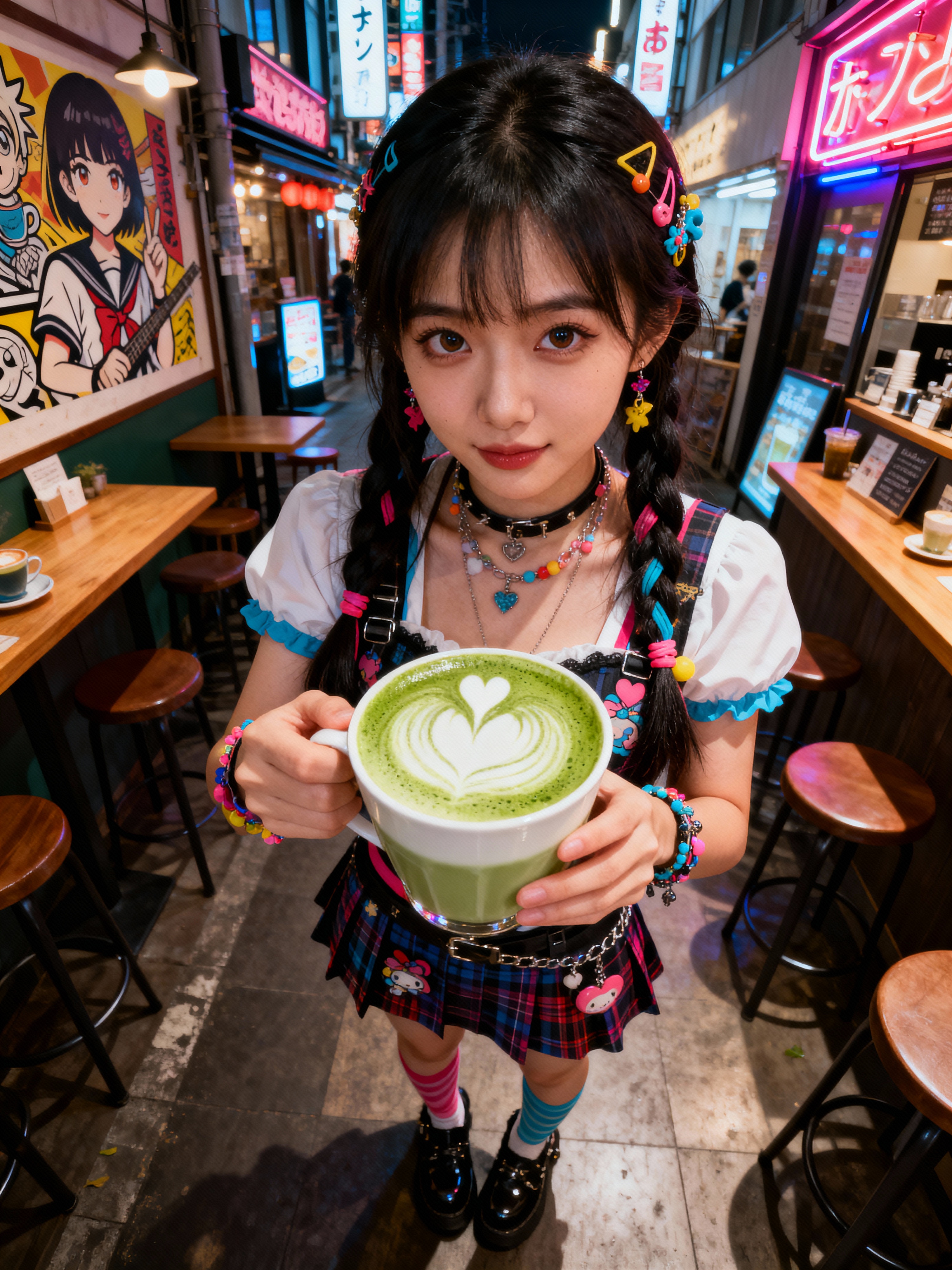model in a trendy café in Harajuku, wearing a kawaii-inspired outfit with colorful accessories , drinking matcha latte