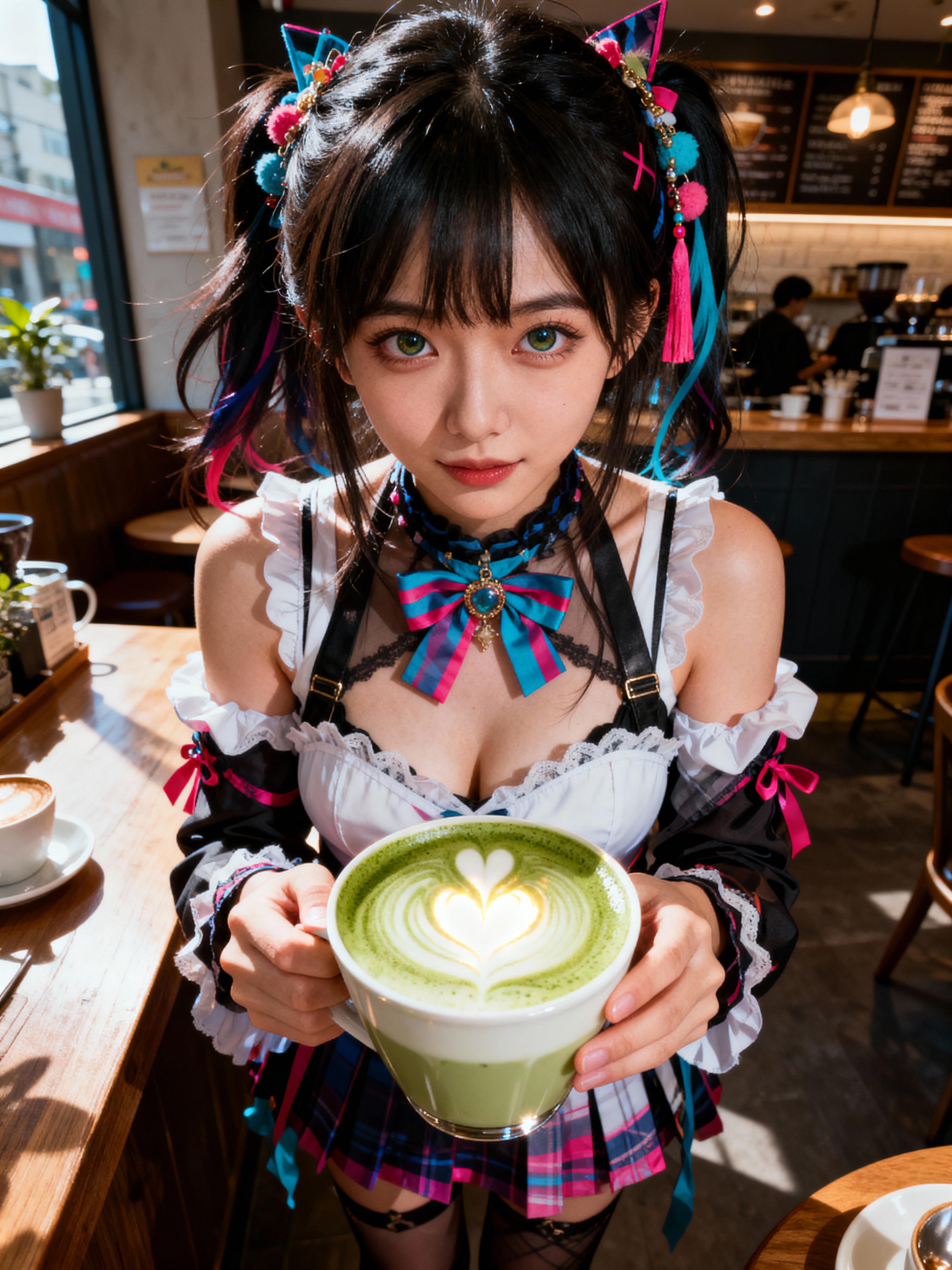 model in a trendy café in Harajuku, wearing a kawaii-inspired outfit with colorful accessories , drinking matcha latte