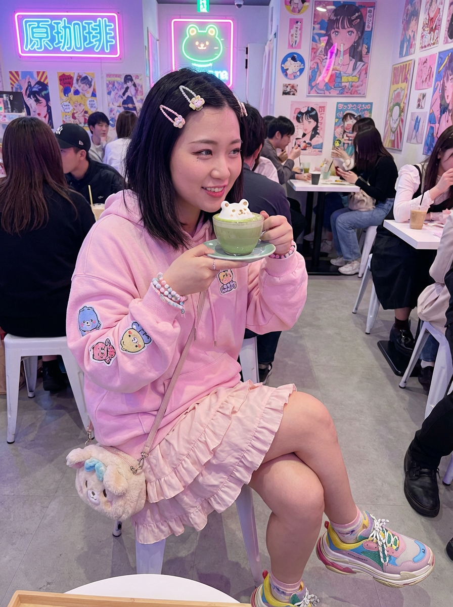 model in a trendy café in Harajuku, wearing a kawaii-inspired outfit with colorful accessories , drinking matcha latte