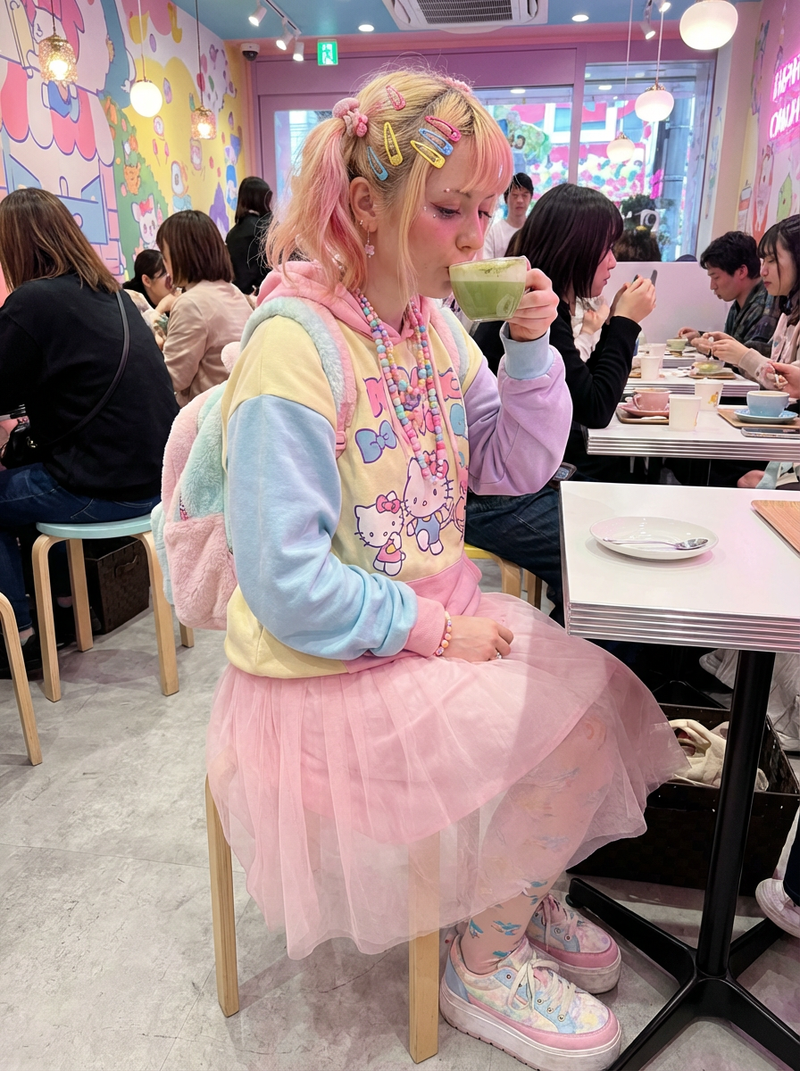 model in a trendy café in Harajuku, wearing a kawaii-inspired outfit with colorful accessories , drinking matcha latte
