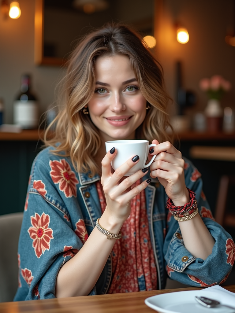 model in a trendy café in Le Marais, wearing a chic outfit with colorful accessories , drinking café au lait