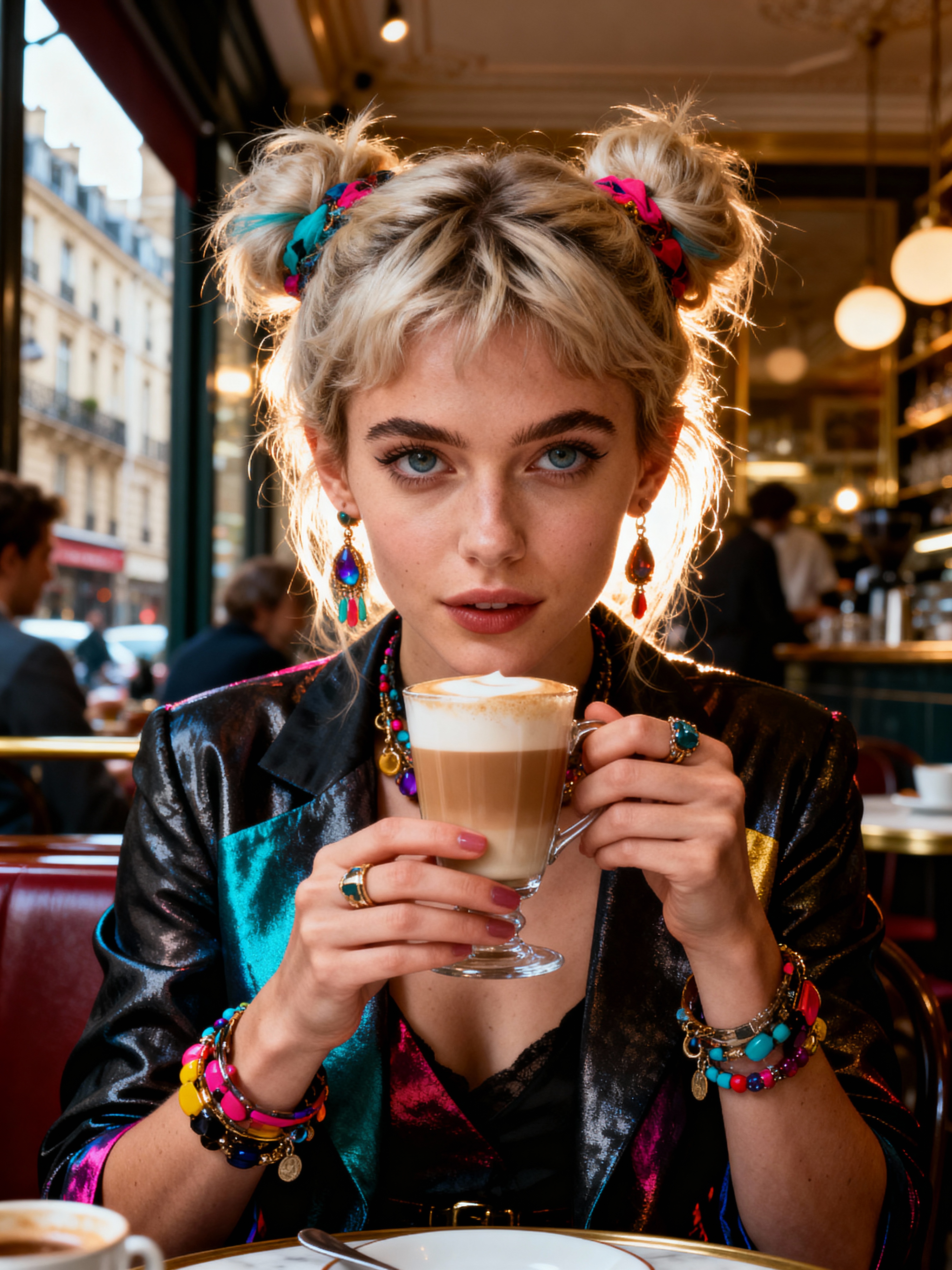 model in a trendy café in Le Marais, wearing a chic outfit with colorful accessories , with a café au lait