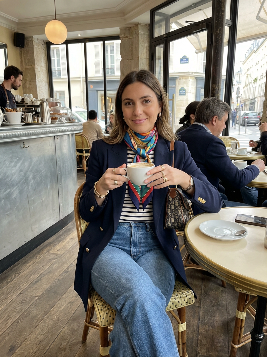 model in a trendy café in Le Marais, wearing a chic outfit with colorful accessories , with a café au lait