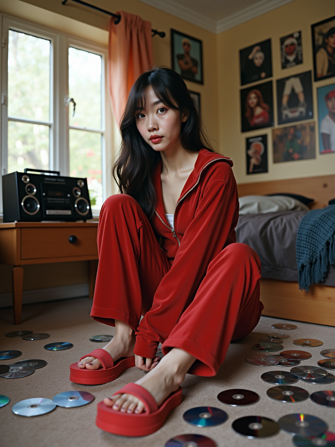 model in a typical 2000s bedroom, wearing a velour tracksuit with platform flip-flops and chunky highlights , surrounded by scattered CDs and burned mix CDs, posters of Britney Spears, NSYNC, and Eminem on the walls, boombox with CD player and radio in background