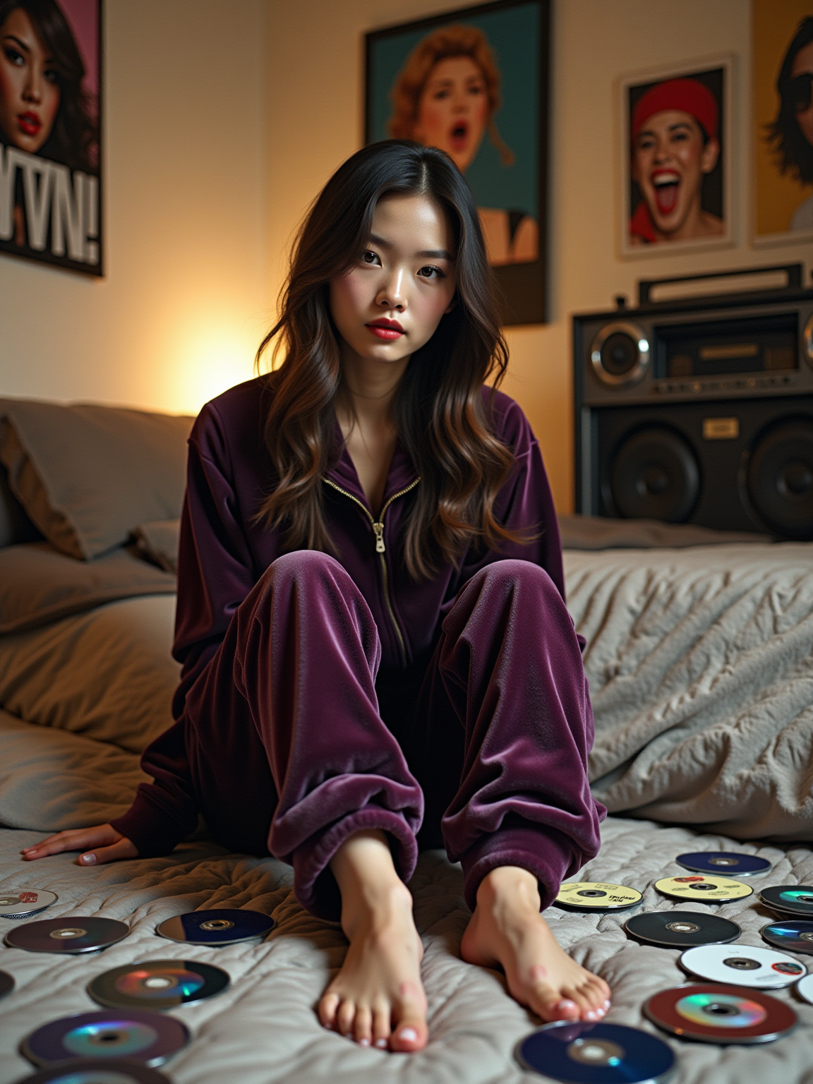 model in a typical 2000s bedroom, wearing a velour tracksuit with platform flip-flops and chunky highlights , surrounded by scattered CDs and burned mix CDs, posters of Britney Spears, NSYNC, and Eminem on the walls, boombox with CD player and radio in background