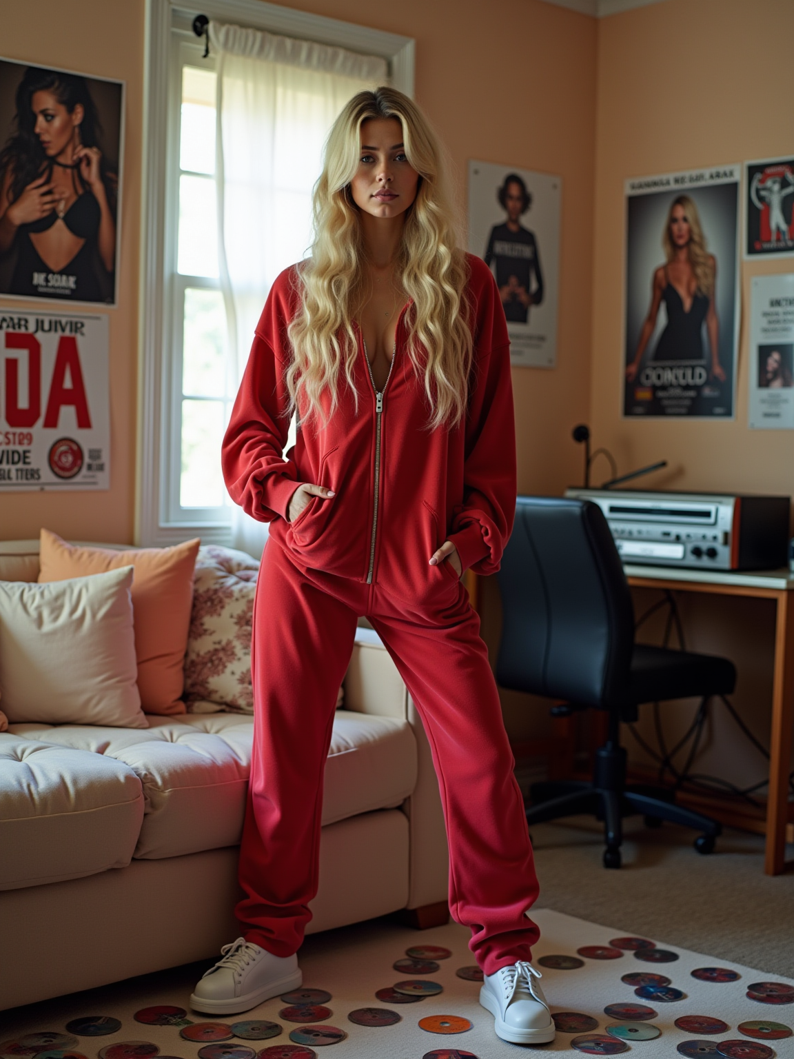 model in a typical 2000s bedroom, wearing a velour tracksuit with platform flip-flops and chunky highlights , surrounded by scattered CDs and burned mix CDs, posters of Britney Spears, NSYNC, and Eminem on the walls, boombox with CD player and radio in background