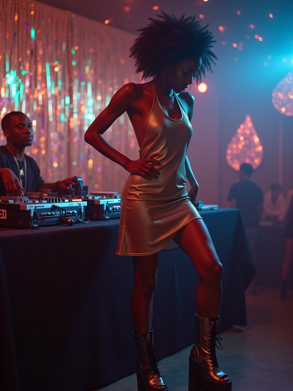 model in a typical 2000s club, wearing a metallic halter dress with platform boots , dancing under strobe lights, CDs displayed behind the DJ booth with dual CD players, metallic and holographic decorations on walls