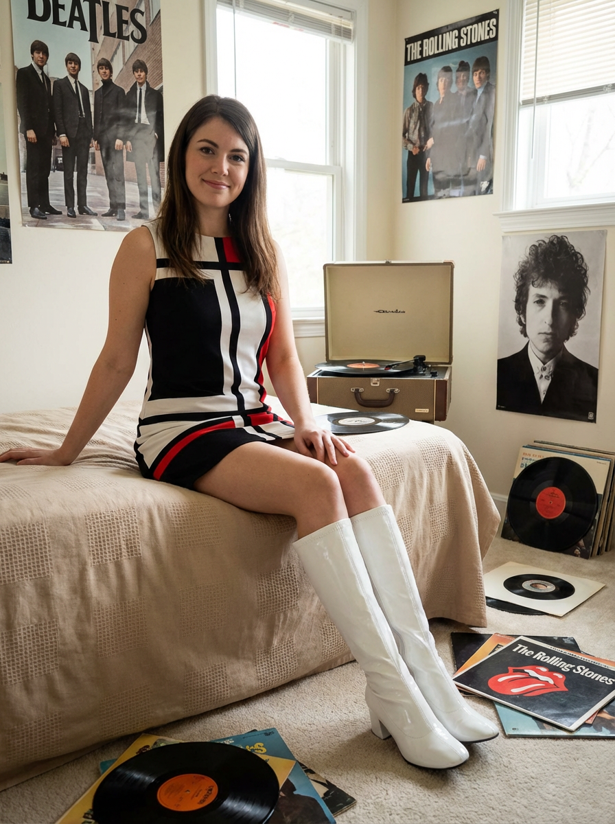 model in a typical 60s bedroom, wearing a mini dress with bold geometric patterns and white go-go boots , surrounded by scattered vinyl singles and album covers, posters of The Beatles, Rolling Stones, and Bob Dylan on the walls, portable record player with built-in speakers in background