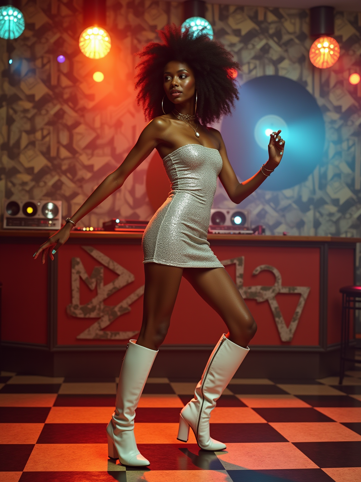 model in a typical 60s dance club, wearing a silver metallic mini dress with white boots , dancing under colored spotlights, vinyl records displayed behind the DJ booth, mod geometric patterns on floor and walls