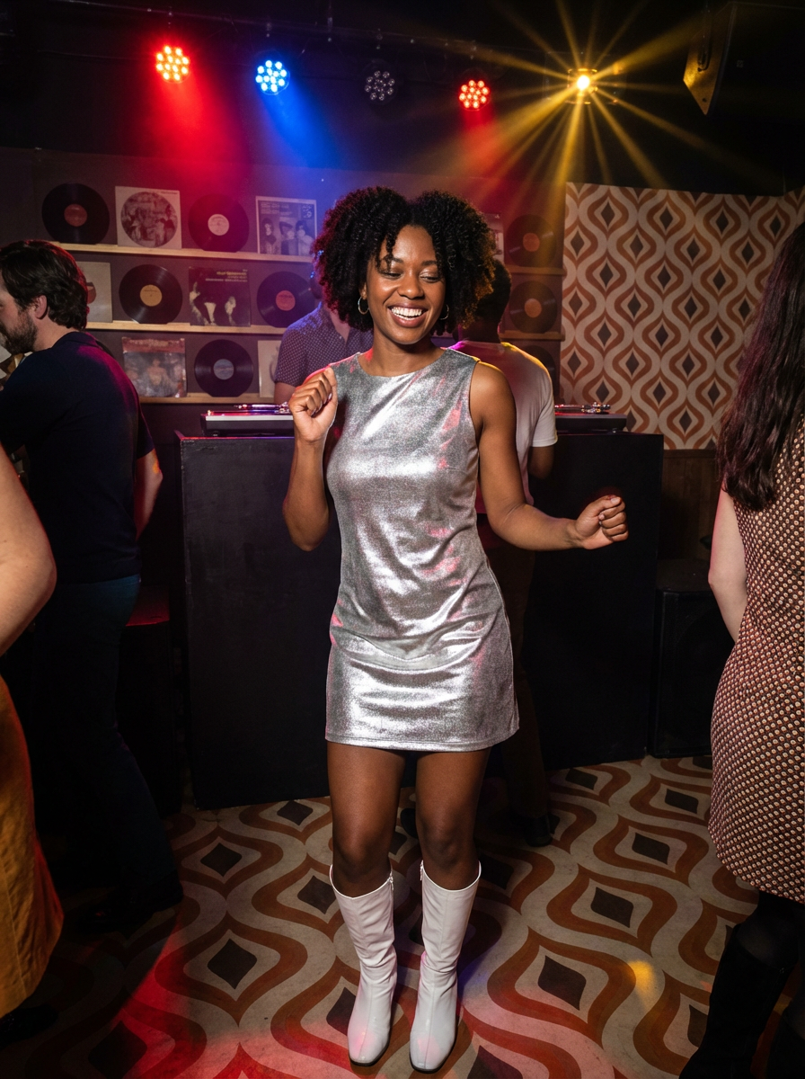 model in a typical 60s dance club, wearing a silver metallic mini dress with white boots , dancing under colored spotlights, vinyl records displayed behind the DJ booth, mod geometric patterns on floor and walls