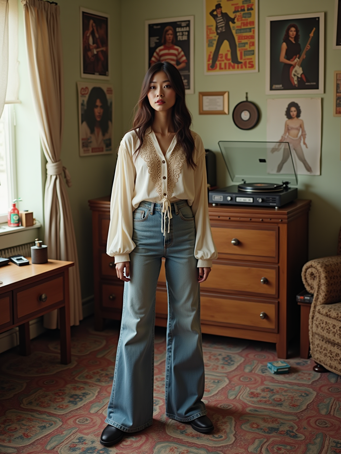 model in a typical 70s bedroom, wearing a peasant blouse with wide-leg jeans and platform shoes , surrounded by scattered vinyl records and 8-track tapes, posters of 70s rock bands and disco stars on the walls, wood-grain stereo system with turntable in background